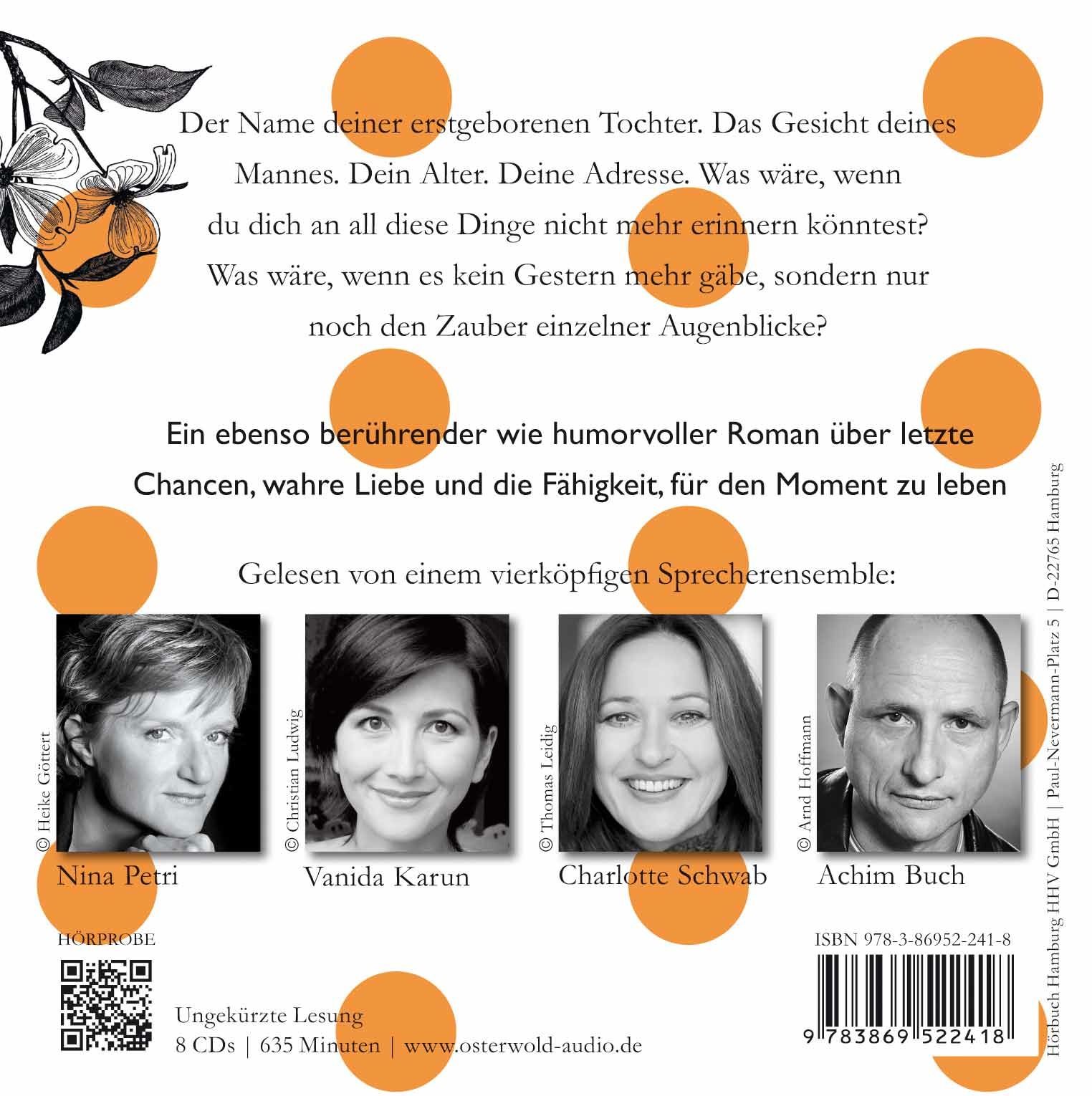 | Schlagworte | Alzheimer • Alzheimersche Krankheit; Romane/Erzählungen • Cecilia Ahern • Familie • Familiengeschichte • Frauenroman • Hörbuch • Hörbuch; Literaturlesung • John Green • Jojo Moyes • Krankheit • Liebe • Liebesgeschichte • mehrere Sprecher • Nicholas Sparks • Roman • Schicksal • sick-lit • Sprecherensemble • Tagebuch • ungekürztes Hörbuch |