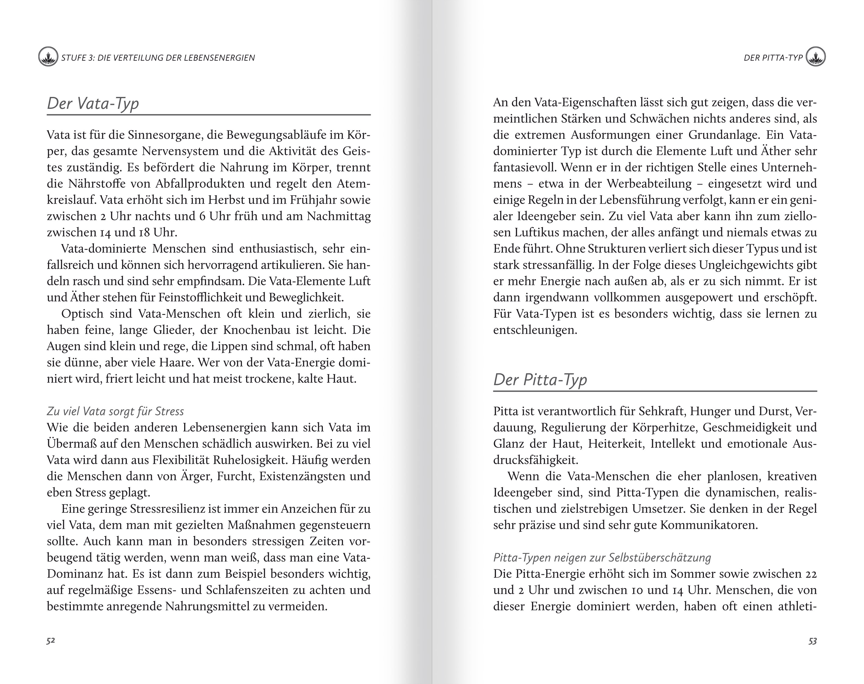 (Auszug aus dem Kapitel "Stufe 9: "Die Energieprogramme")IHR PERSÖNLICHES ENERGIEPROGRAMMUm Körper, Geist und Seele auf ein Energielevel zu bringen oder es zu erhalten, auf dem wir uns wohl und leistungsfähig fühlen, sollten Ernährung und körperliche Aktivität zur individuellen Dosha-Konstitution passen.Auf den folgenden Seiten finden Sie ein zehntägiges Entschlackungsprogramm für alle drei Doshas sowie ein darauf aufbauendes Ernährungs- und Aktiv-Programm, das auf die drei Doshas zugeschnitten ist. Bitte verstehen Sie diese Tipps als Impulse und wählen Sie aus, was sich für Sie richtig anfühlt. Sie selbst haben das beste Gespür dafür, was Ihnen guttut. Ayurveda ist nicht dogmatisch an starre Regeln gebunden. Im Mittelpunkt steht, dass Sie sich gut fühlen und Ihr Energiepotenzial ausschöpfen können!Nach den Entschlackungstagen ist ein guter Zeitpunkt, Ihre Ernährungsgewohnheiten neu zu überdenken. In der Regel fühlen Sie sich nach der Entgiftung voller Energie.Indem Sie künftig mit größerer Achtsamkeit Ihre Ernährung zusammenstellen und sie zu sich nehmen, können Sie diesen Zustand beibehalten. Sie haben bereits erfahren, dass nicht alles, was in den westlichen Gesellschaften gemeinhin als gesund gilt, für Ihr Dosha förderlich sein muss. Auf den folgenden Seiten finden Sie eine Auswahl an Lebensmitteln, die Ihr Dosha unterstützen und stärken.Wie immer im Ayurveda gilt: Seien Sie nicht dogmatisch und kasteien Sie sich nicht! Es geht darum, ein gesundes Bewusstsein dafür zu entwickeln, was Ihnen guttut. Wenn Sie auch mal Lust auf andere Lebensmittel haben - genießen Sie sie und machen Sie sich kein schlechtes Gewissen! Es gibt keine Verbote, das Programm zielt nicht auf Enthaltsamkeit ab. Ihre innere Reinigung sollten Sie mit Freude verbinden!Die Rezepte für die Doshas wurden von Gudrun Glock, Ayurveda-Köchin, Ernährungs- und Gesundheitsberaterin, zusammengestellt. Gewürze und andere Zutaten sind entsprechend den zu bevorzugenden Eigenschaften der Nahrungsmittel so ausgewählt, dass sie das jeweilige Dosha nicht erhöhen. Als Eiweißlieferant können Hülsenfrüchte, zum Beispiel Mungbohnen, dienen, die von allen Typen gut vertragen werden. Die Rezeptvorschläge sehen drei Mahlzeiten pro Tag vor: einen ayurvedischen Frühstücksbrei (warmes Getreide), ein Mittagessen, bestehend aus gemischten Gemüsen mit Beilage, und eine Abendsuppe.(...)