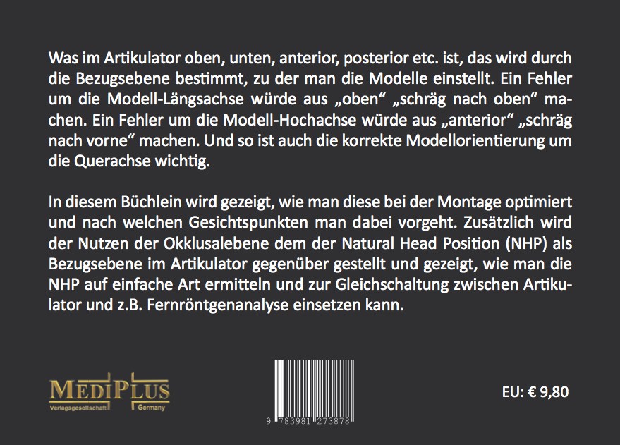 In diesem Bu¨chlein wird gezeigt, wie man diese bei der Montage optimiert und nach welchen Gesichtspunkten man dabei vorgeht. Zusa¨tzlich wird der Nutzen der Okklusalebene dem der Natural Head Position (NHP) als Bezugsebene im Artikulator gegenu¨ber gestellt und gezeigt, wie man die NHP auf einfache Art ermitteln und zur Gleichschaltung zwischen Artikulator und z.B. Fernro¨ntgenanalyse einsetzen kann.