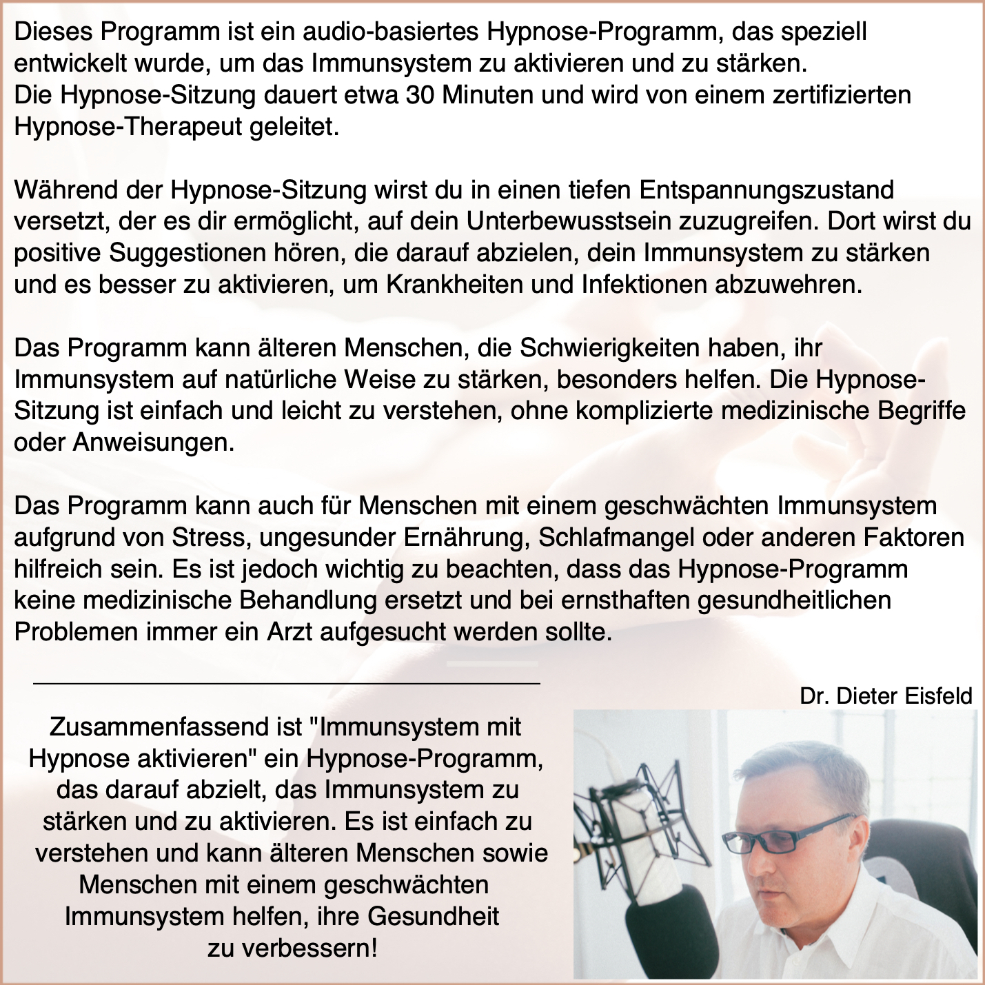 Das Programm kann älteren Menschen, die Schwierigkeiten haben, ihr Immunsystem auf natürliche Weise zu stärken, besonders helfen. Die Hypnose-Sitzung ist einfach und leicht zu verstehen, ohne komplizierte medizinische Begriffe oder Anweisungen.