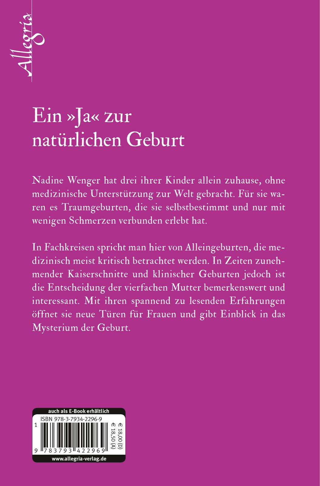 Die Beweggründe von Nadine Wenger lesen sich nachvollziehbar und schlüssig. Sie lebt den Traum ihrer weiblichen Bestimmung und Natur bewusst und selbstbestimmt. Vier ihrer fünf Kinder hat sie allein geboren und dabei tiefes Glück erfahren.