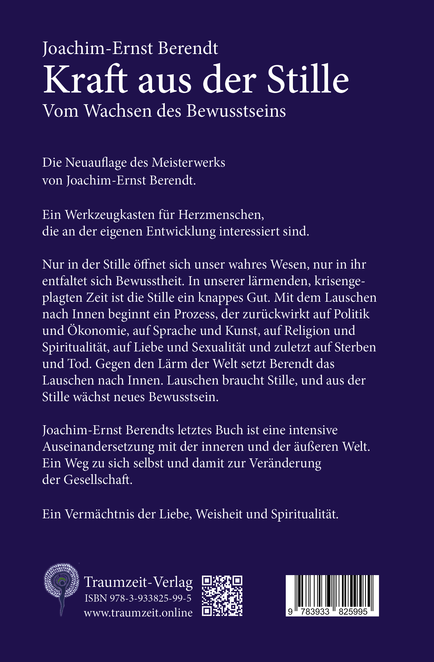 Kraft aus der Stille - vom Wachsen des Bewusstseins ist Joachim-Ernst Berendts letztes Werk und wirkt schon fast wie ein Vermächtnis. Denn die Themen, die er beschreibt, sind aktueller denn je und man fragt sich, ob dieses Buch tatsächlich schon ein Vierteljahrhundert alt sein kann. Umfassend, tiefgehend und das Herz berührend nimmt dich Berendt wie gewohnt auf eine inspirierende Reise ins Querdenken, ins In-die-Tiefe-Lauschen und in eine Welt, in der Liebe, Sinnlichkeit und Einander-Zuhören mehr Sinn den je machen.Du wirst dich beim Lesen beobachten und oftmals feststellen wie du erkennst: Das habe ich schon so lange auch so gefühlt oder gedacht und hier findet einer die richtigen Worte und sagt dir: Es ist voller Kraft, Mut und Zukunftsperspektive, was du da in dir wahrnimmst.Wir erleben in unseren Tagen wie der Lärm in unserer Welt immer mehr eskaliert. Wie er benutzt wird, um die Menschen zu verwirren, zu entzweien und in Abhängigkeiten zu führen. Kraft aus der Stille wirkt hier wie ein Befreiungsschlag, denn es führt dich an deine innere Kraft und nährt dich mit wunderschönen Gedanken, die den Mut machen, an ein Morgen zu glauben. Ein Morgen, in dem die Menschheit einen Schritt weiter geht in Richtung Frieden und Harmonie.Dieser Schritt beginnt, so Berendt, mit dir und deiner inneren Haltung. Dieses Buch ist schlicht ein Kraftwerk der Liebe, ein Quell der Freude. Eine Inspiration, deinem Herzen zu folgen.