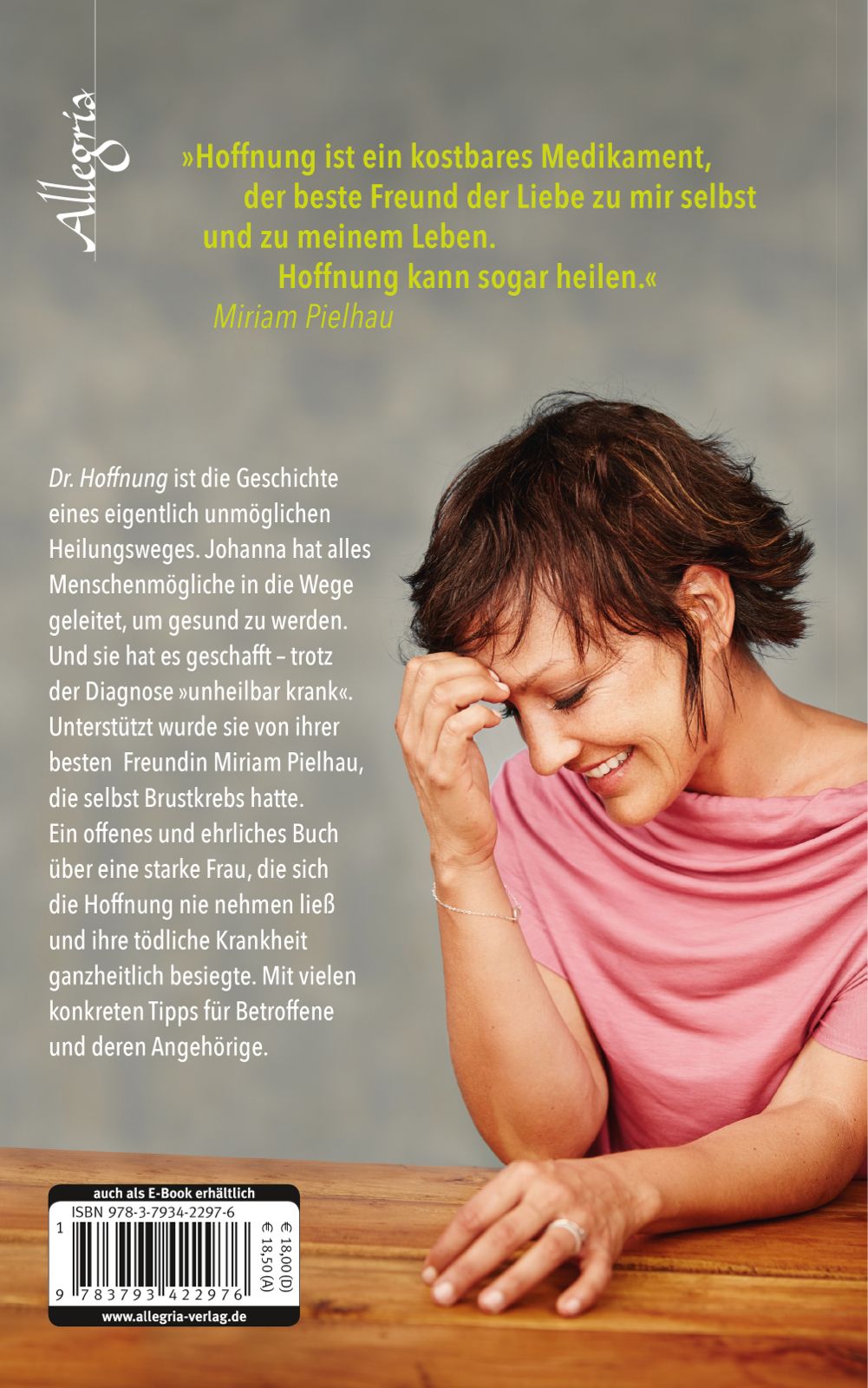 "Dr. Hoffnung" ist die Geschichte eines eigentlich unmöglichen Heilungsweges. Johanna hat alles Menschenmögliche in die Wege geleitet, um gesund zu werden. Und sie hat es geschafft - trotz der Diagnose "unheilbar krank". Unterstützt wurde sie von ihrer besten Freundin Miriam Pielhau, die selbst Brustkrebs hatte. Ein offenes und ehrliches Buch über eine starke Frau, die sich die Hoffnung nie nehmen ließ und ihre tödliche Krankheit ganzheitlich besiegte. Mit vielen konkreten Tipps für Betroffene und deren Angehörige.