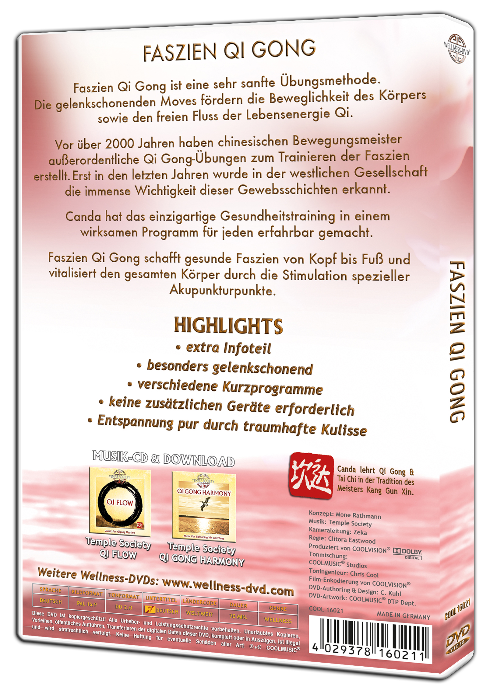 Im alten China gab es spezielle Bewegungsformen, die die Faszien besonders intensiv trainierten, sie bilden die Basis in Candas Programm Faszien Qi Gong. In fließenden Bewegungsabläufen wird konsequent das komplexe Zusammenspiel von mehreren Faszienbahnen unterstützt, dabei wird besonders der Rücken gekräftigt. Zusätzlich fördert die Stimulation spezieller Akupunkturpunkte die Gesundheit der inneren Organe.