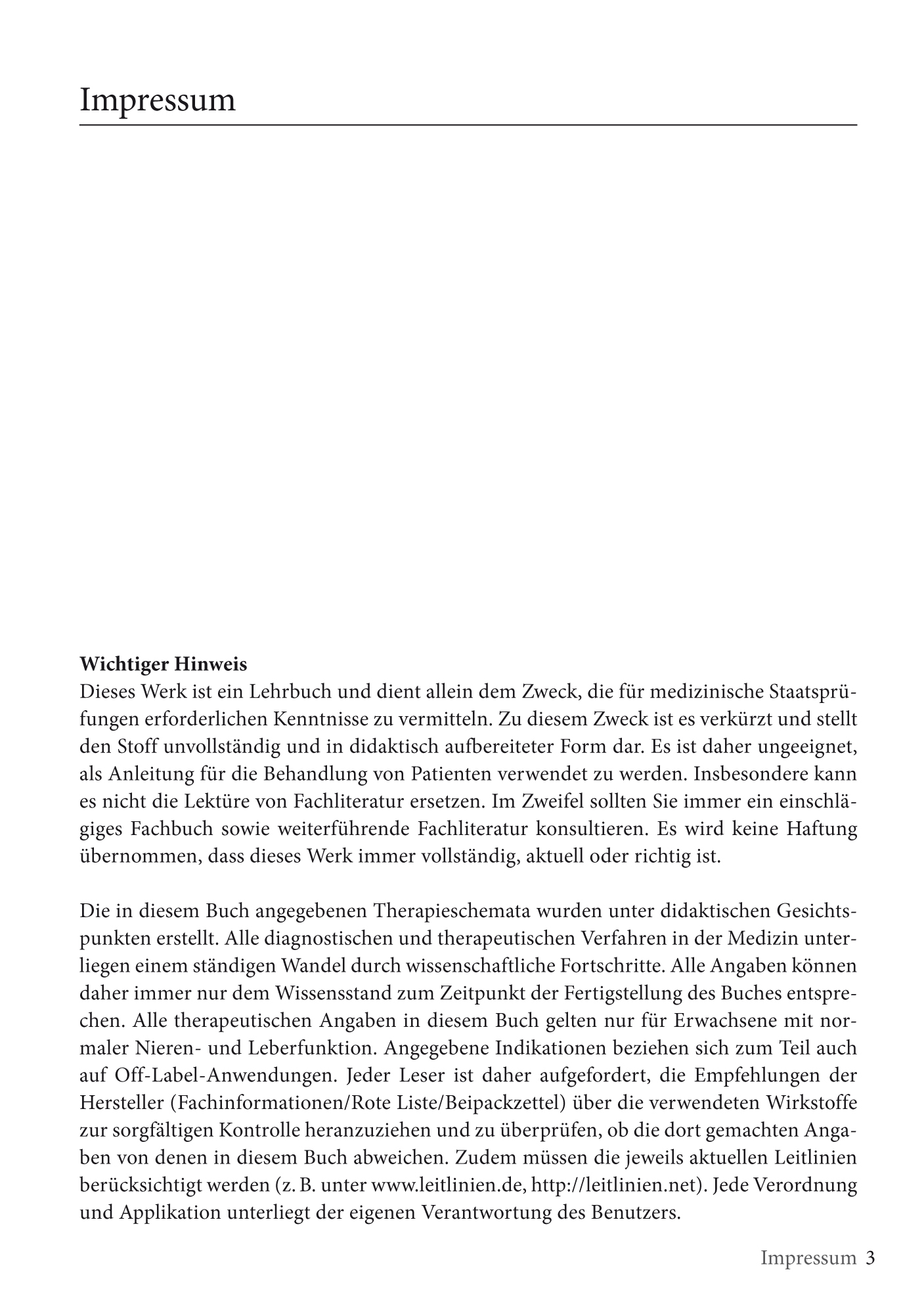 Dieses Buch zeichnet sich durch folgende Besonderheiten aus: Struktur: Wir haben uns für eine gleichbleibende Darstellung der Medikamente entschieden. In einer 4-Felder-Tafel sind Indikationen, Wirkung, unerwünschte Arzneimittelwirkungen (UAW) und Kontraindikationen (KI) aufgeführt. Sollen wichtige Interaktionen hervorgehoben werden, sind diese in einem zusätzlichen Kästchen beschrieben. Kerninhalte: Kerninhalte der Pharmakologie sollen vermittelt werden: Die Schwierigkeit beim Lernen besteht oftmals darin, Relevantes von weniger Relevantem zu unterscheiden. Unser Buch soll dabei helfen, eine Grundlage für dieses spannende, aber auch sehr umfangreiche Stoffgebiet zu schaffen - beim Einstieg in das Fach und bei der Wiederholung. Weiterentwicklung: Es handelt sich nicht um ein abgeschlossenes Werk: Zahlreiche Spezialisten, die ihre Fachgebiete verständlich und knapp darstellen können, haben bislang bei der Erstellung mitgeholfen. Wir hoffen, dass dieses Buch weiterhin von der Mithilfe vieler Interessierter profitieren kann. Jeder Leser ist daher aufgerufen, die Inhalte kritisch zu hinterfragen und gegebenenfalls bei der Weiterentwicklung mitzuarbeiten. Zuschriften sind ausdrücklich erwünscht. Anpassung: Da das Buch in kurzen Abständen neu erscheint, können wir sehr schnell auf veränderte Leitlinien und neu hinzugekommene Inhalte in den aktuellen Staatsexamina reagieren. Fett markierter Text wurde bereits im „Hammerexamen“ abgefragt oder ist besonders wichtig für das Staatsexamen. *Die in diesem Buch aufgeführten Informationen stellen eine Auswahl dar und sind außerdem als gruppenspezifische Eigenschaften anzusehen, die ggf. nicht für jeden Wirkstoff aus der jeweiligen Gruppe zutreffen. Das Buch erhebt keinen Anspruch auf Vollständigkeit. Gerade im Bereich der UAW, Kontraindikationen und Interaktionen haben wir häufig aus didaktischen Gründen eine knappe Auswahl getroffen (gelegentlich sogar keine Informationen angegeben) und beschränken uns teilweise auf Inhalte, die bereits in Staatsexamina abgefragt wurden. Wir haben generell darauf verzichtet, bei den Kontraindikationen Schwangerschaft und Stillzeit aufzulisten, da eine Arzneimitteltherapie in diesen Situationen immer eine Einzelfallentscheidung darstellt und verallgemeinernde Aussagen dazu schlecht getroffen werden können. Auch die Arzneimitteltherapie bei Kindern stellt eine besondere Situation dar. Daher müssen Hinweise, ob Medikamente z. B. bei Kindern, in der Schwangerschaft und Stillzeit oder auch bei Nieren- oder Leberinsuffizienz kontraindiziert sind, unbedingt in den entsprechenden Fachinformationen nachgelesen werden. Juliane Bolbrinker / Daniel Flaschar Berlin, Januar 2016
