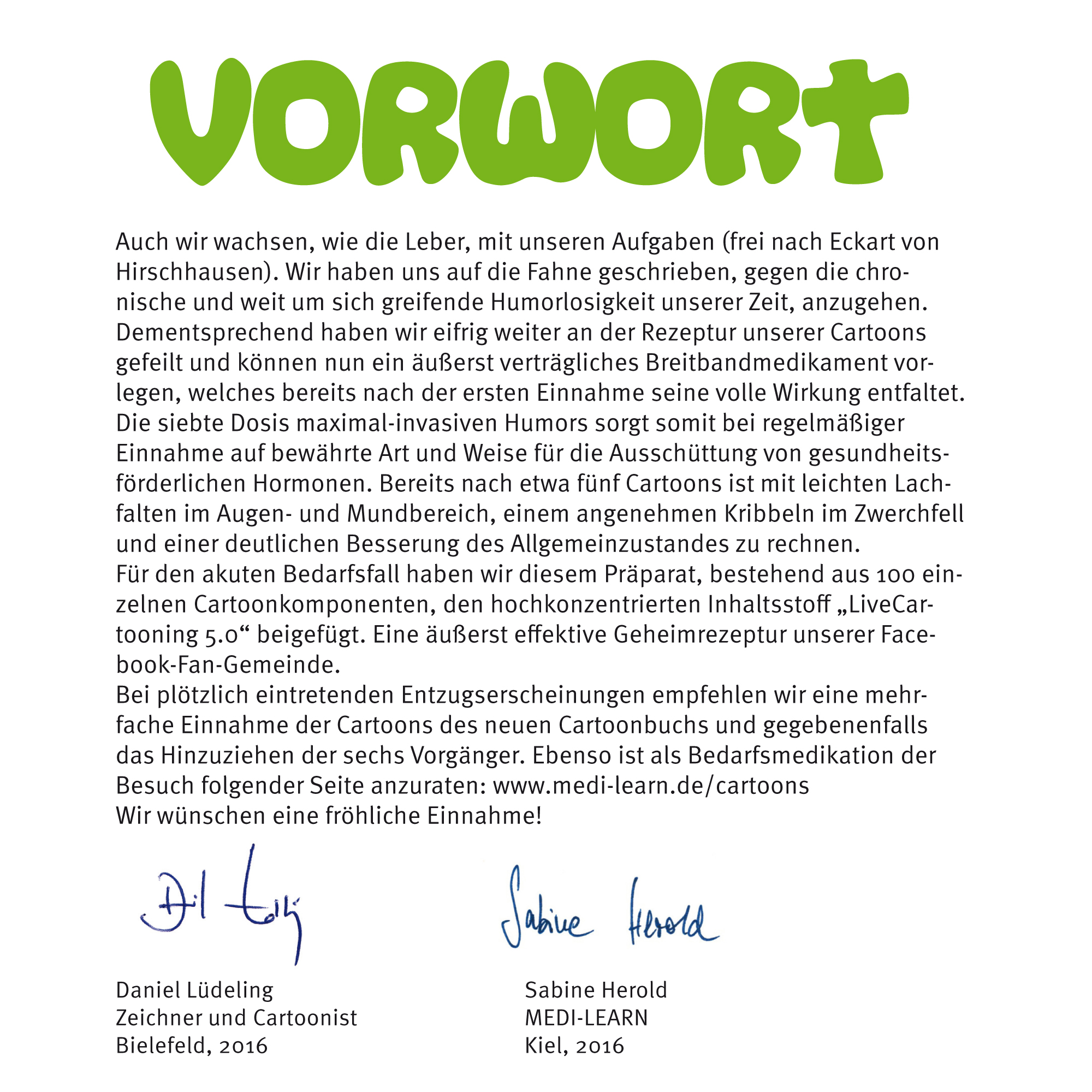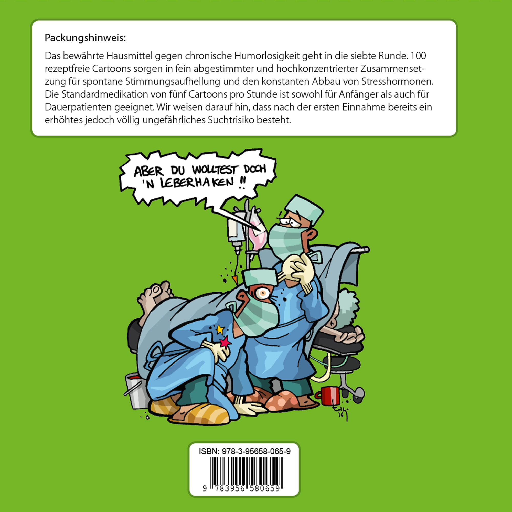 Auch wir wachsen, wie die Leber, mit unseren Aufgaben (frei nach Eckart von Hirschhausen). Wir haben uns auf die Fahne geschrieben, gegen die chronische und weit um sich greifende Humorlosigkeit unserer Zeit, anzugehen. Dementsprechend haben wir eifrig weiter an der Rezeptur unserer Cartoons gefeilt und können nun ein äußerst verträgliches Breitbandmedikament vorlegen, welches bereits nach der ersten Einnahme seine volle Wirkung entfaltet. Die siebte Dosis maximal-invasiven Humors sorgt somit bei regelmäßiger Einnahme auf bewährte Art und Weise für die Ausschüttung von gesundheitsförderlichen Hormonen. Bereits nach etwa 5 Cartoons ist mit leichten Lachfalten im Augen- und Mundbereich, einem angenehmen Kribbeln im Zwerchfell und einer deutlichen Besserung des Allgemeinzustandes zu rechnen. Für den akuten Bedarfsfall haben wir diesem Präparat, bestehend aus 100 einzelnen Cartoonkomponenten, den hochkonzentrierten Inhaltsstoff „LiveCartooning 5.0“ beigefügt. Eine äußerst effektive Geheimrezeptur unserer Facebook-Fan-Gemeinde. Bei plötzlich eintretenden Entzugserscheinungen empfehlen wir eine mehrfache Einnahme der Cartoons des neuen Cartoonsbuches und gegebenenfalls das Hinzuziehen der sechs Vorgänger. Ebenso ist als Bedarfsmedikation der Besuch folgender Seite anzuraten: www.medi-learn.de/cartoons Wir wünschen eine fröhliche Einnahme!