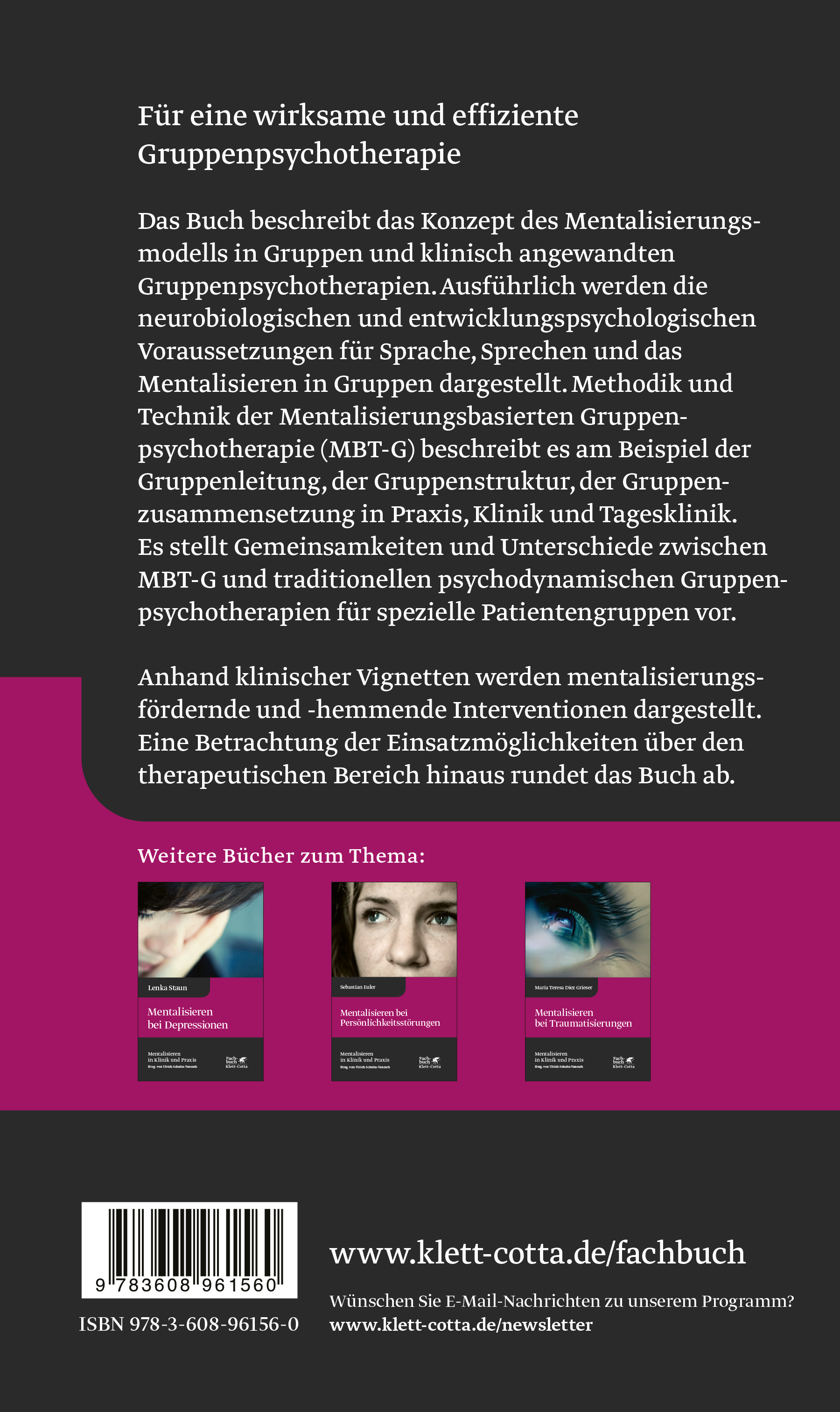Das Buch beschreibt das Konzept des Mentalisierungsmodells in Gruppen und klinisch angewandten Gruppenpsychotherapien. Ausführlich werden die neurobiologischen und entwicklungspsychologischen Voraussetzungen für Sprache, Sprechen und das Mentalisieren in Gruppen dargestellt. Methodik und Technik der Mentalisierungsbasierten Gruppenpsychotherapie (MBT-G) beschreibt es am Beispiel der Gruppenleitung, der Gruppenstruktur, der Gruppenzusammensetzung in Praxis, Klinik und Tagesklinik und stellt Gemeinsamkeiten Unterschiede zwischen MBT-G und traditionellen psychodynamischen Gruppenpsychotherapien für spezielle Patientengruppen vor. Anhand klinischer Vignetten werden mentalisierungsfördernde und -hemmende Interventionen dargestellt. Eine Betrachtung der Einsatzmöglichkeiten über den therapeutischen Bereich hinaus rundet das Buch ab.