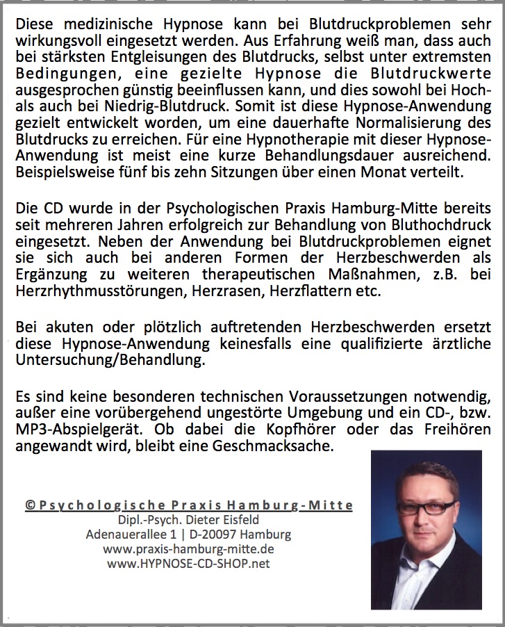 | Schlagworte | Blutdruck • Bluthochdruck • Eisfeld • Hamburg • Herz • Hypnose • Hypnose-CD • Hypnotherapie • Kreislauf |
