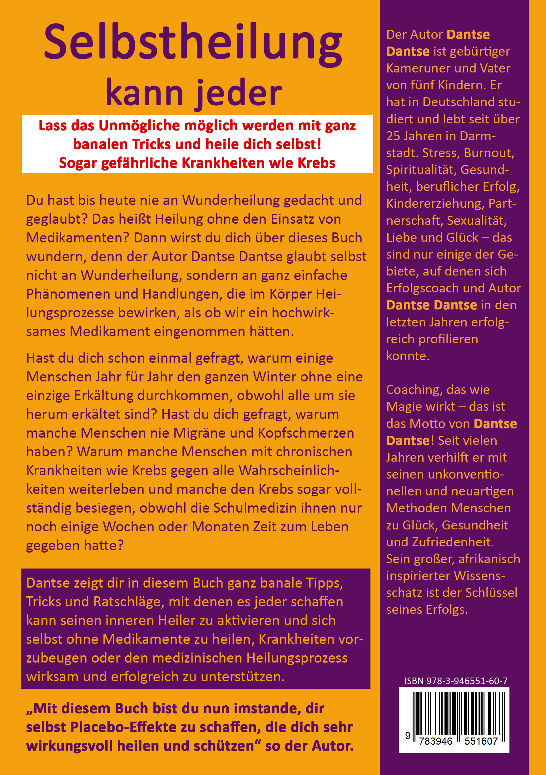 Selbstheilung kann jeder!Lass das Unmögliche möglich werden mit ganz banalen Tricks und heile dich selbst! Sogar gefährliche Krankheiten wie Krebs.Du hast bis heute nie an Wunderheilung gedacht und geglaubt? Das heißt Heilung ohne den Einsatz von Medikamenten? Dann wirst du dich über dieses Buch wundern, denn der Autor Dantse Dantse glaubt selbst nicht an Wunderheilung, sondern an ganz einfache Phänomenen und Handlungen, die im Körper Heilungsprozesse bewirken, als ob wir ein hochwirksames Medikament eingenommen hätten. Hast du dich schon einmal gefragt, warum einige Menschen Jahr für Jahr den ganzen Winter ohne eine einzige Erkältung durchkommen, obwohl alle um sie herum erkältet sind? Hast du dich gefragt, warum manche Menschen nie Migräne und Kopfschmerzen haben? Warum manche Menschen mit chronischen Krankheiten wie Krebs gegen alle Wahrscheinlichkeiten weiterleben und manche den Krebs sogar vollständig besiegen, obwohl die Schulmedizin ihnen nur noch einige Wochen oder Monaten Zeit zum Leben gegeben hatte? Du kennst vielleicht die Geschichte von diesem Deutschen, der unheilbar an Krebs erkrankt war und nur noch paar Monate zu leben hatte. Nachdem alle Untersuchungen das gleiche Ergebnis brachten, zog er sich nicht zurück in die Einsamkeit, sondern ging nach Süd-Amerika zu den Indianern am Amazonas und zwei Jahren später war er immer noch am Leben. Er kam zurück nach Deutschland, ließ sich untersuchen, und der Krebs war weg. Er meinte, im Busch, weit weg von Stress, hatte er Ruhe, er hatte seine Krankheit ignoriert, war positiv eingestellt und hatte Freude um sich.Die Zeitung DIE ZEIT berichtet unter www.zeit.de/2011/30/M-Selbstheilung-Remissionen auch von solchen Phänomenen, bei denen plötzlich ein totkranker Mensch wieder gesund wird. In einem Fall ging es um eine Frau, die angeblich nicht mehr lange leben würde, doch bei ihr verschwand der Krebs vollständig. Es war keine spontane Heilung, wie die Ärzte es gern gehabt hätten, sondern ein Prozess, der mit der Lebenseinstellung der Frau zu tun hatte. Sie war: "kämpferisch. Sie denkt positiv und ist religiös."Viele Menschen kommen zu Coach Dantse mit unterschiedlichen Beschwerden. Bei zahlreichen konnten durch sein Coaching ihre Selbstheilungskräfte entfaltet werden, so dass sie sich selbst beschwerdefrei bekamen. Die meisten von ihnen haben aufgehört Tabletten einzunehmen und wie durch ein Wunder sind die jahrelangen Schmerzen dennoch nicht mehr gekommen. Bei einigen gingen die Beschwerden wieder los, sobald sie mit den alten Gewohnheiten wieder anfingen.Dantses Mutter geht seit 45 Jahren nicht zum Arzt und nimmt keine Medikamente ein, seine Geschwister, die alle in Deutschland studiert haben und hier arbeiten, gehen ebenfalls kaum zum Arzt und nehmen selten Medikamente ein.Dantse selbst ist seit zig Jahren in top Verfassung und das letzte Mal, dass er beim Arzt war, war wegen seines Zahns. Tabletten nimmt er seit mindesten 25 Jahren nicht.Alle diese Beispiele zeigen, dass es Mechanismen außerhalb der Molekularbiologie gibt, die dazu führen, dass wir uns selbst ohne Medikamente und schmerzhafte Therapien heilen können, mit ganz einfachen und wirklich banalen Tipps wie die Krankheit ignorieren, träumen und fantasieren, Ruhe, kalt duschen, positiv denken, gesunde Ernährung, lachen, usw.Du kannst das Unmögliche geschehen lassen, wenn du ab heute die Tipps und Tricks in diesem Buch umsetzt.Die Wissenschaft benutzt dieses Wissen, um manche Patienten zu heilen. Sie nennt es Placebo-Effekt.Placebo ist, anders erklärt, einfach ein Prinzip, das darauf basiert, dass du dich selbst heilst, weil du glaubst, das Medikament habe dich geheilt, obwohl in dem Medikament null Wirkstoff enthalten ist. Aber die Medizin will wohl den Menschen diesen Weg nicht richtig erklären, damit sie selbst nicht überflüssig wird? Mit diesem Buch bist du nun imstande, dir selbst Placebo-Effekte zu schaffen, die dich sehr wirkungsvoll heilen und schützen.Mit der Selbstheilung stellt man die Gesu
