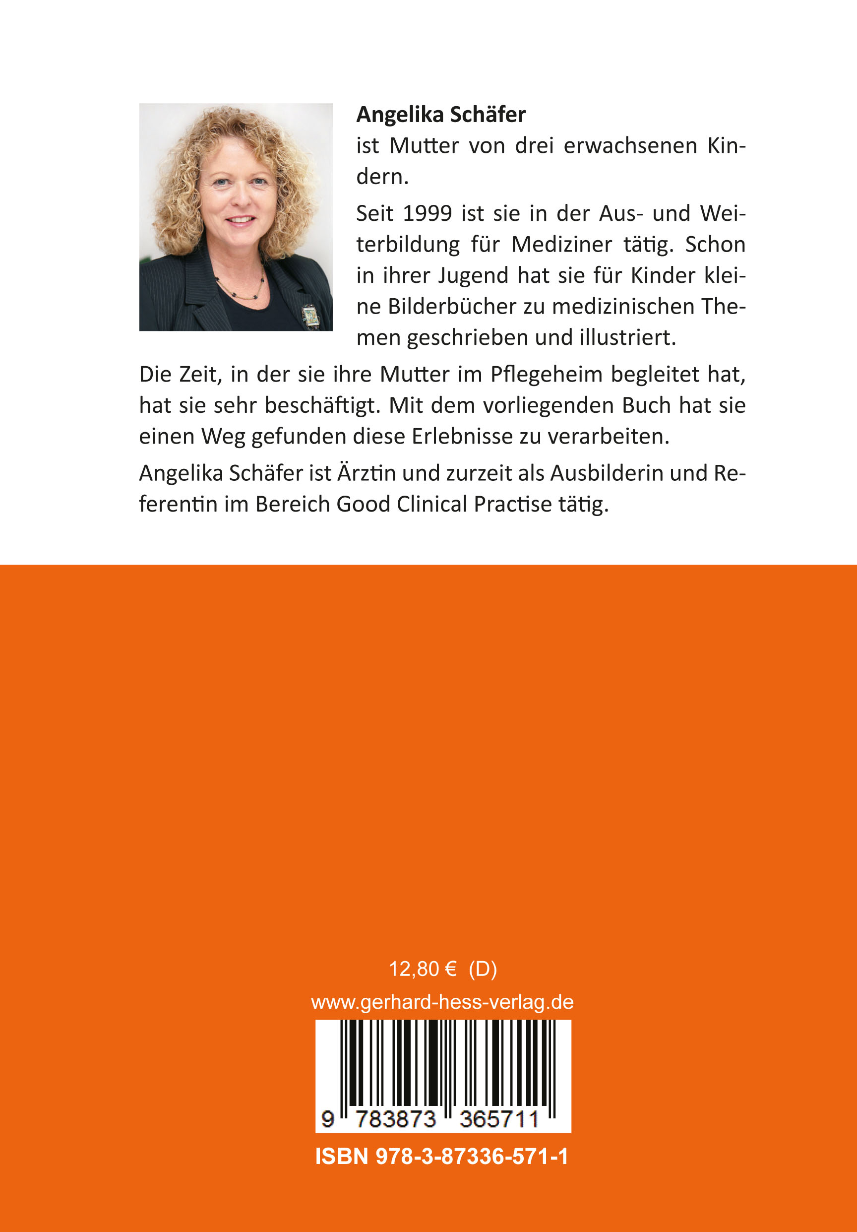 Die Autorin ist seit 1999 in der Aus- und Weiterbildung für Mediziner tätig. Schon in ihrer Jugend hat sie für Kinder kleine Bilderbücher zu medizinischen Themen geschrieben und illustriert. Die Zeit, in der sie ihre Mutter im Pflegeheim begleitet hat, hat sie sehr beschäftigt. Mit dem vorliegenden Buch hat sie einen Weg gefunden diese Erlebnisse zu verarbeiten. Angelika Schäfer ist Ärztin und zurzeit als Ausbilderin und Referentin im Bereich Good Clinical Practise tätig.
