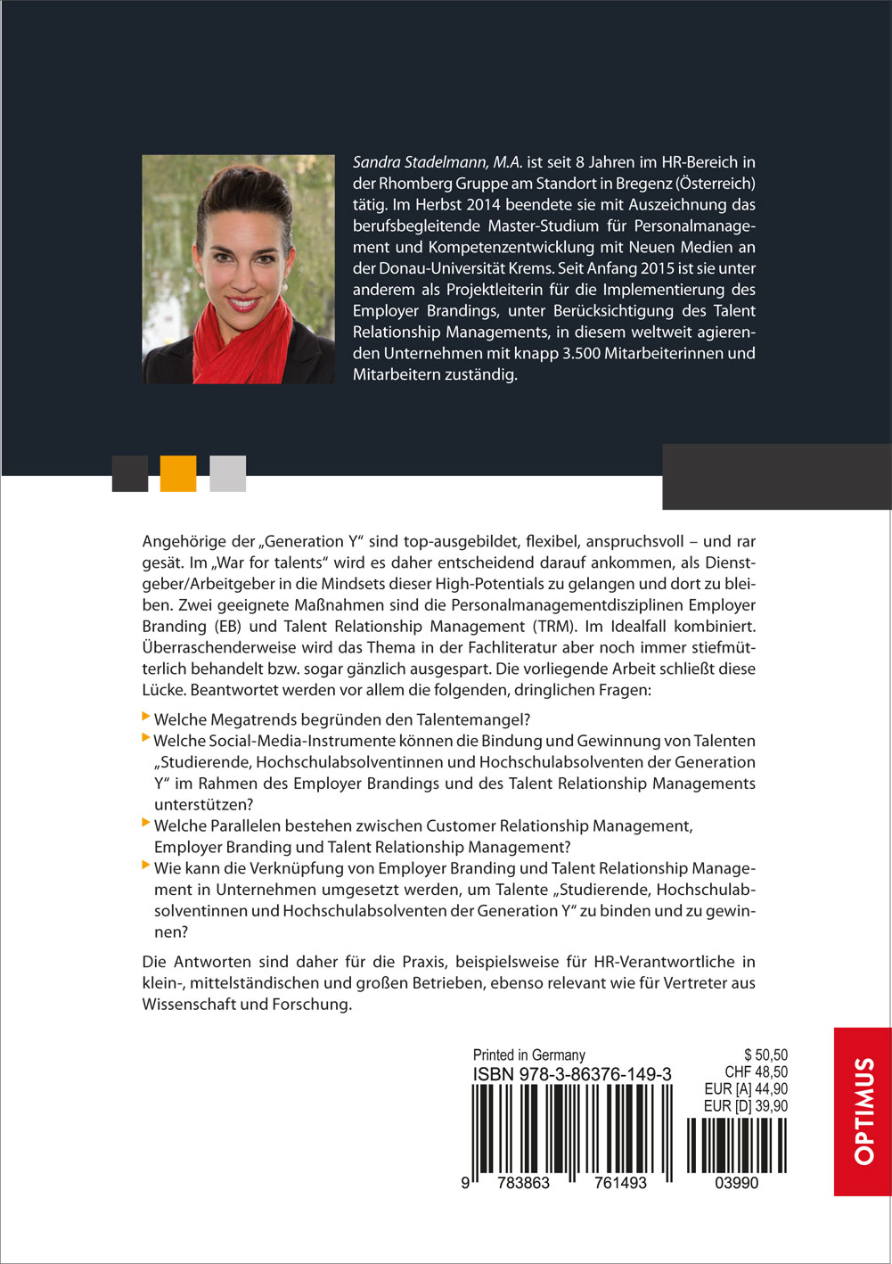Angehörige der „Generation Y“ sind top-ausgebildet, flexibel, anspruchsvoll – und rar gesät. Im „War for talents“ wird es daher entscheidend darauf ankommen, als Dienstgeber/Arbeitgeber in die Mindsets dieser High-Potentials zu gelangen und dort zu bleiben. Zwei geeignete Maßnahmen sind die Personalmanagementdisziplinen Employer Branding (EB) und Talent Relationship Management (TRM). Im Idealfall kombiniert. Überraschenderweise wird das Thema in der Fachliteratur aber noch immer stiefmütterlich behandelt bzw. sogar gänzlich ausgespart. Die vorliegende Arbeit schließt diese Lücke. Beantwortet werden vor allem die folgenden, dringlichen Fragen: