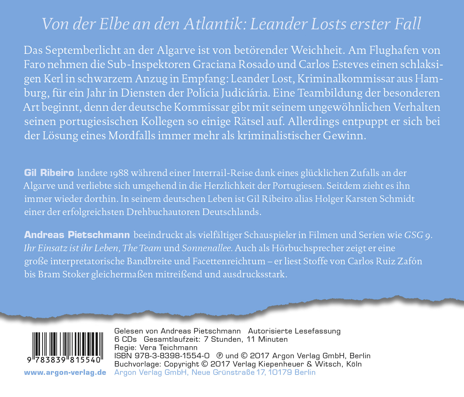 Gil Ribeiro, geboren 1965 in Hamburg, landete 1988 während einer Interrail-Reise quer durch Europa nur dank eines glücklichen Zufalls an der Algarve und verliebte sich umgehend in die Herzlichkeit und Gastfreundschaft der Portugiesen. Seitdem zieht es ihn immer wieder in das kleine Städtchen Fuseta an der Ost-Algarve, wo ihm die Idee zu Lost in Fuseta kam. In seinem deutschen Leben ist Gil Ribeiro alias Holger Karsten Schmidt seit vielen Jahren einer der erfolgreichsten Drehbuchautoren Deutschlands: Anfang 2020 erschien sein Kriminalroman Die Toten von Marnow, der im Frühjahr 2021 in der ARD als Mini-Serie zu sehen war. Holger Karsten Schmidt lebt und arbeitet bei Stuttgart.