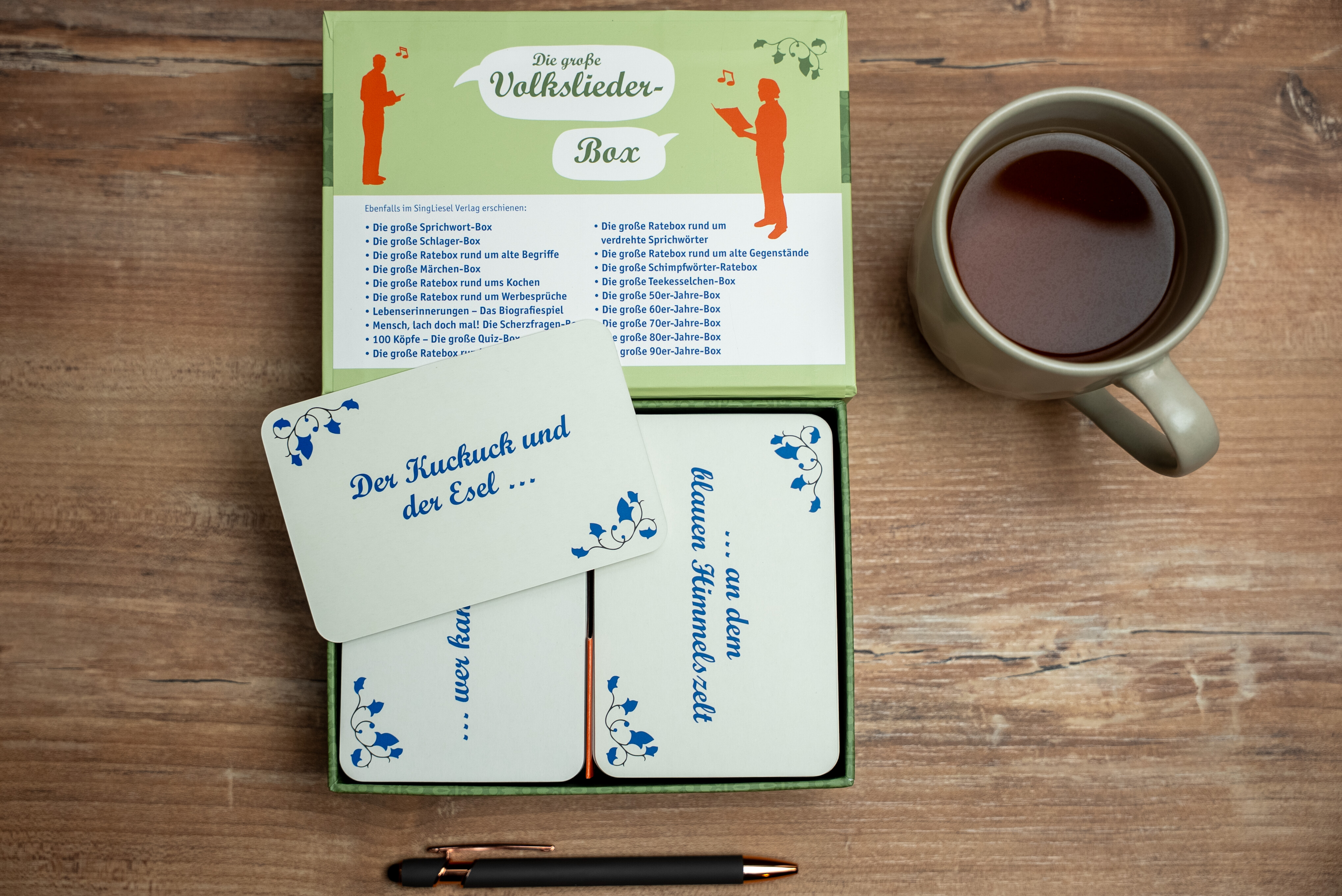 Die große Volkslieder-Quiz-Box für Senioren. Das Spiel rund um bekannte Volkslieder für Senioren. Auch mit Demenz. Spiele Box mit 100 Karten.