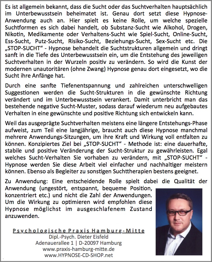 Es ist allgemein bekannt, dass die Sucht oder das Suchtverhalten hauptsächlich im Unterbewusstsein beheimatet ist. Genau dort setzt diese Hypnose-Anwendung auch an. Hier spielt es keine Rolle, um welche spezielle Suchtformen es sich dabei handelt, ob Substanz-Sucht wie Alkohol, Drogen, Nikotin, Medikamente oder Verhaltens-Sucht wie Spiel-Sucht, Online-Sucht, Ess-Sucht, Putz-Sucht, Risiko-Sucht, Beziehungs-Sucht, Sex-Sucht etc. Die „STOP-SUCHT“ - Hypnose behandelt die Suchtstrukturen allgemein und dringt sanft in die Tiefe des Unterbewusstsein ein, um die Entstehung des jeweiligen Suchtverhalten in der Wurzeln positiv zu verändern. So wird die Kunst der modernen unautoritären (ohne Zwang) Hypnose genau dort eingesetzt, wo die Sucht ihre Anfänge hat.