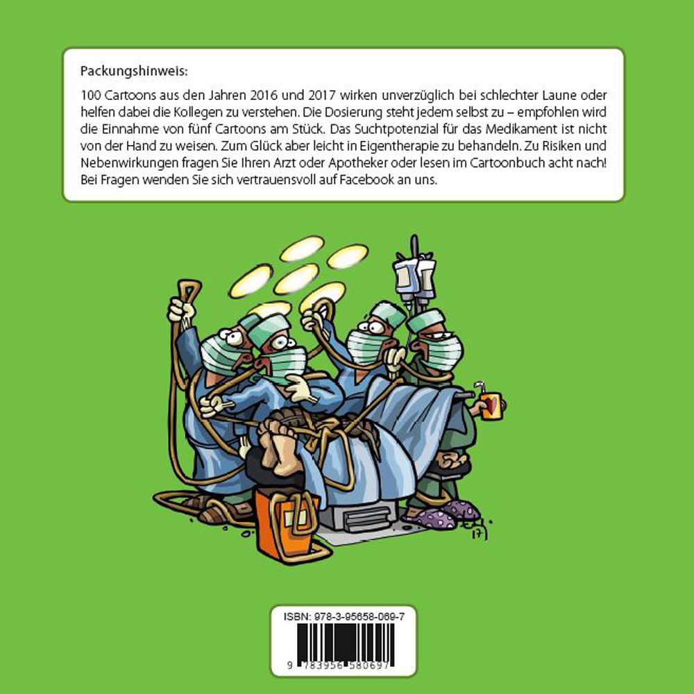 Für die achte Fortsetzung des Cartoonbuches haben wir uns eine leicht verdauliche Rezeptur an Cartoons ausgesucht und empfehlen die kontrollierte, aber stetige Einnahme. Bereits fünf Cartoons heben das Wohlbefinden schon deutlich und bei beinahe allen Probanden war nach der Lektüre aller 100 Cartoons ein gesundes, kräftiges Lachen die - unsererseits natürlich nicht unbeabsichtigte - Folge. Lachsalven bis hin zum Lachmuskelkater kamen ebenfalls vor. Stört ja auch nicht unbedingt.Mit den rezeptfreien Cartoons, die auf eigenen Erfahrungen und echten Fakten beruhen, wird die Welt mal wieder in ein anderes, zum Glück natürlich lustigeres Licht gerückt. So bekommen z. B. neben Darth Vader u. a. auch Dr. A. Nal, zudem noch Götter oder aber "stinknormale" Patienten in unserem Buch eine Doppelseite geschenkt.Stichwort Schwarmintelligenz: Natürlich haben die beiden Veranstaltungen, die wir mit unseren Facebook-Fans in 2016 beim LiveCartooning veranstaltet haben, einen Platz im Cartoonbuch acht gefunden. Noch einmal vielen, vielen Dank an alle Beteiligten für die genialen Ideen!Sollte es soweit kommen, dass dein Gemüt heftig auf das Entziehen der Cartoons reagiert, empfehlen wir als Gegenmittel die Dosierung der Cartoons zu steigern: schau dir einfach mal eines der Cartoonbücher eins bis sieben an oder besuche uns im Internet unter www.medi-learn.de/cartoonsGenug der Worte...Viel Spaß mit den Cartoons!