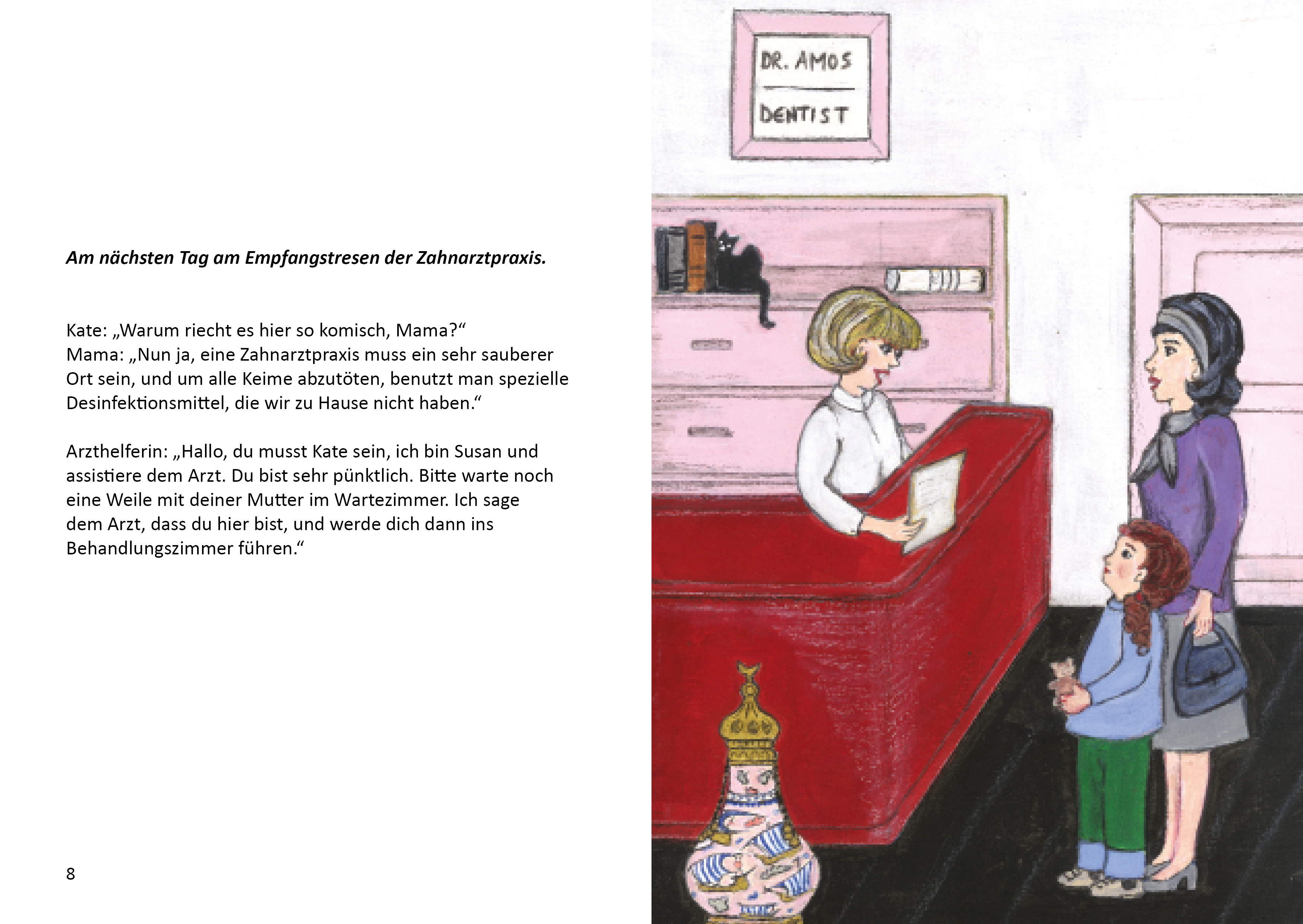 Dr. Amos kann alle Fragen, die Kate an ihn hat, perfekt beantworten. Dafür sorgt das fachliche Wissen des Autors. Wichtig in dieser Situation ist, dass der Zahnarztbesuch frei von Angstgefühlen und Belastungen stattfinden kann. Gut gemeinte Formulierungen wie „Du brauchst keine Angst haben“ oder „Es tut auch nicht weh“ bringen den Nachwuchs erst auf die Idee, dass ein Zahnarztbesuch unangenehm verlaufen könnte. Statt dessen sollte die natürliche kindliche Neugier geweckt werden. Das klappt, wenn das Kind zuvor schon spielerisch erfahren hat, wie es im inneren seines Mundes aussieht. Belohnungsgeschenke für einen tapfer überstandenen Zahnarzttermin zu versprechen, ist sicher nicht empfehlenswert. Das setzt ein Kind nur unnötig unter Druck. Der Zahnarzt in „Kate & Dr. Amos“ gibt ein gutes Beispiel, wie die erste Untersuchung ablaufen kann. Das Buch ist also bestens geeignet, um ein Kind auf spielerische Weise auf das bevorstehende Ereignis einzustimmen.
