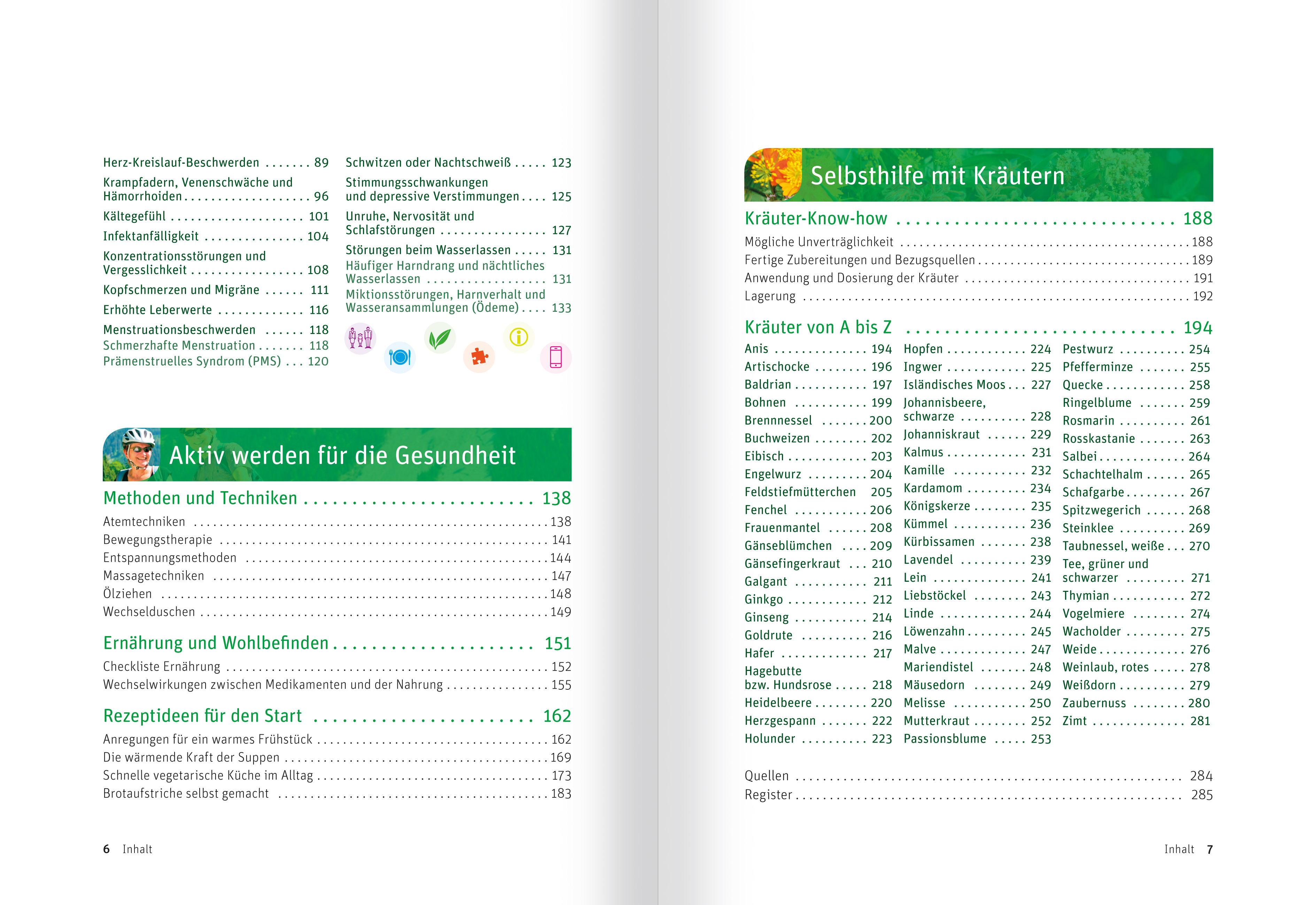 - Heilkräuter, Ernährungsempfehlungen, Atem- und Entspannungstechniken, praktische Tipps zur Lebensführung, hilfreiche Checklisten u. v. m.