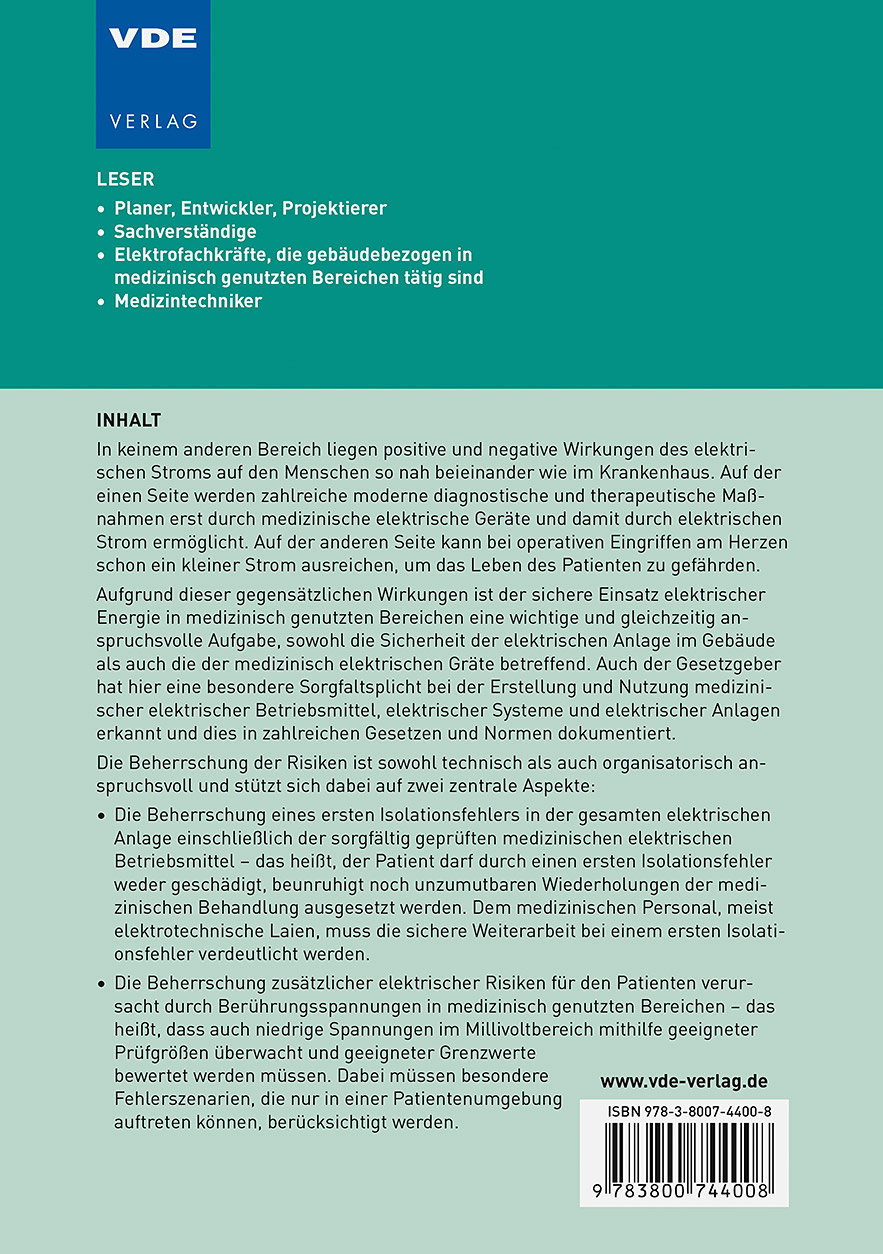 In keinem anderen Bereich liegen positive und negative Wirkungen des elektrischen Stroms auf den Menschen so nah beieinander wie im Krankenhaus. Auf der einen Seite werden zahlreiche moderne diagnostische und therapeutische Maßnahmen erst durch medizinische elektrische Geräte und damit durch elektrischen Strom ermöglicht. Auf der anderen Seite kann bei operativen Eingriffen am Herzen schon ein kleiner Strom ausreichen, um das Leben des Patienten zu gefährden.Aufgrund dieser gegensätzlichen Wirkungen ist der sichere Einsatz elektrischer Energie in medizinisch genutzten Bereichen eine wichtige und gleichzeitig anspruchsvolle Aufgabe, sowohl die Sicherheit der elektrischen Anlage im Gebäude als auch die der medizinisch elektrischen Gräte betreffend. Auch der Gesetzgeber hat hier eine besondere Sorgfaltsplicht bei der Erstellung und Nutzung medizinischer elektrischer Betriebsmittel, elektrischer Systeme und elektrischer Anlagen erkannt und dies in zahlreichen Gesetzen und Normen dokumentiert.Die Beherrschung der Risiken ist sowohl technisch als auch organisatorisch anspruchsvoll und stützt sich dabei auf zwei zentrale Aspekte:- Die Beherrschung eines ersten Isolationsfehlers in der gesamten elektrischen Anlage einschließlich der sorgfältig geprüften medizinischen elektrischen Betriebsmittel - das heißt, der Patient darf durch einen ersten Isolationsfehler weder geschädigt, beunruhigt noch unzumutbaren Wiederholungen der medizinischen Behandlung ausgesetzt werden. Dem medizinischen Personal, meist elektrotechnische Laien, muss die sichere Weiterarbeit bei einem ersten Isolationsfehler verdeutlicht werden.- Die Beherrschung zusätzlicher elektrischer Risiken für den Patienten verursacht durch Berührungsspannungen in medizinisch genutzten Bereichen - das heißt, dass auch niedrige Spannungen im Millivoltbereich mithilfe geeigneter Prüfgrößen überwacht und geeigneter Grenzwerte bewertet werden müssen. Dabei müssen besondere Fehlerszenarien, die nur in einer Patientenumgebung auftreten können, berücksichtigt werden.