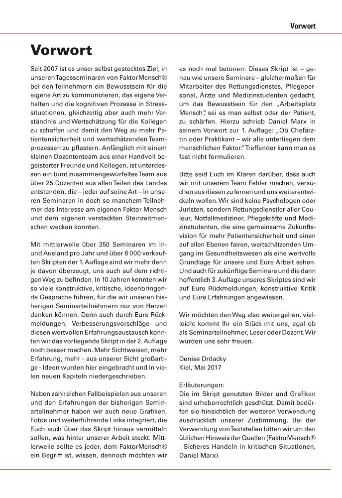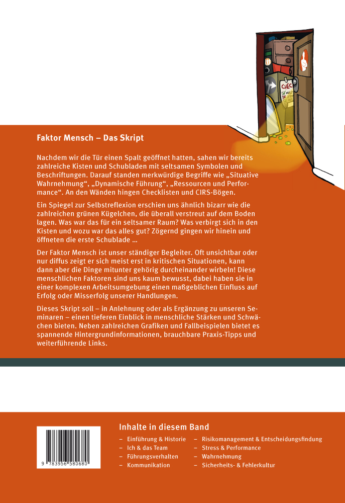 Faktor Mensch - Das SkriptNachdem wir die Tür einen Spalt geöffnet hatten, sahen wir bereits zahlreiche Kisten und Schubladen mit seltsamen Symbolen und Beschriftungen. Darauf standen merkwürdige Begriffe wie "Situative Wahrnehmung", "Dynamische Führung", "Ressourcen und Performance". An den Wänden hingen Checklisten und CIRS-Bögen.Ein Spiegel zur Selbstreflexion erschien uns ähnlich bizarr wie die zahlreichen grünen Kügelchen, die überall verstreut auf dem Boden lagen. Was war das für ein seltsamer Raum? Was verbirgt sich in den Kisten und wozu war das alles gut? Zögernd gingen wir hinein und öffneten die erste Schublade ...Der Faktor Mensch ist unser ständiger Begleiter. Meist unsichtbar oder nur diffus zeigt er sich meist erst in kritischen Situationen, kann dann aber die Dinge mitunter gehörig durcheinander wirbeln! Diese menschlichen Faktoren sind uns kaum bewusst, dabei haben sie in einer komplexen Arbeitsumgebung einen maßgeblichen Einfluss auf Erfolg oder Misserfolg unserer Handlungen.Dieses Skript soll - in Anlehnung oder als Ergänzung zu unseren Seminaren - einen tieferen Einblick in menschliche Stärken und Schwächen bieten. Neben zahlreichen Grafiken und Fallbeispielen bietet es spannende Hintergrundinformationen, brauchbare Praxis-Tipps und weiterführende Links.