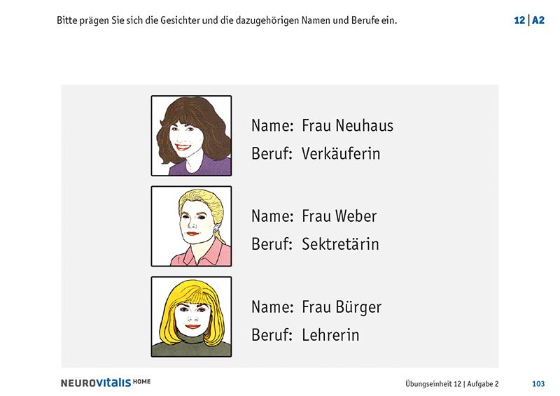 NeuroVitalis home ist ein kognitives Übungsprogramm, das in Ergänzung oder unabhängig vom NeuroVitalis Gruppenprogramm im häuslichen Eigentraining oder in der Einzeltherapie durchgeführt werden kann. Die Aufgaben wurden von Neurowissenschaftlern in Anlehnung an aktuelle wissenschaftliche Erkenntnisse theoriegeleitet entwickelt. Mit 180 anregenden Übungen auf zwei unterschiedlichen Schwierigkeitsstufen aktiviert es das Arbeitsgedächtnis, das Neulernen, Aufmerksamkeit, planerische Fähigkeiten und Wortflüssigkeit. Eine Lösungsbeilage ermöglicht eine schnelle und übersichtliche Prüfung der Ergebnisse. Neurovitalis ist ein wissenschaftlich fundiertes neuropsychologisches Gruppentraining zur Förderung der geistigen Leistungsfähigkeit. Es richtet sich an ältere Menschen, die präventiv einem altersbedingten kognitiven Leistungsabbau entgegenwirken möchten und an Patienten, die unter leichten kognitiven Störungen leiden und ihr geistiges Leistungsvermögen stabilisieren möchten. Für den Einsatz in Kliniken, Praxen und Senioreneinrichtungen bietet es mit seinen strukturierten Durchführungsanleitungen für den Übungsleiter, den funktionsspezifischen Übungen und den psychoedukativen Therapieelementen ein wirksames und abwechslungsreiches Training.