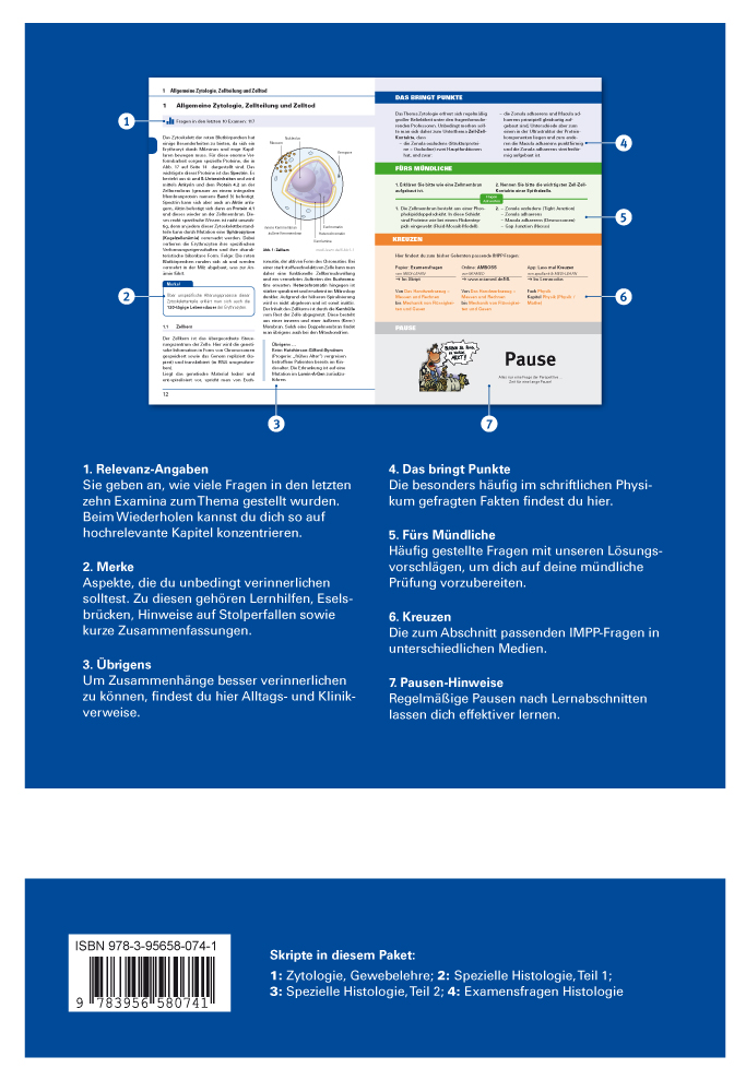 Liebe Leserin, lieber Leser,zu viel Stoff und zu wenig Zeit - diese zwei Faktoren führen stets zu demselben unschönen Ergebnis: Prüfungsstress!Was soll ich lernen? Wie soll ich lernen? Wie kann ich bis zur Prüfung noch all das verstehen,was ich bisher nicht verstanden habe? Die Antworten auf diese Fragen liegen meist im Dunkeln, die Mission Prüfungsvorbereitung erscheint vielen von vornherein unmöglich.Mit der MEDI-LEARN Skriptenreihe greifen wir dir genau bei diesen Problemen fachlich undlernstrategisch unter die Arme.Wir helfen dir, die enorme Faktenflut des Prüfungsstoffes zu minimieren und gleichzeitig deine Bestehenschancen zu maximieren. Dazu haben unsere Autoren die bisherigen Examina(vor allem die aktuelleren) sowie mehr als 5000 Prüfungsprotokolle analysiert. Durch den Ausschluss von "exotischen", d. h. nur sehr selten gefragten Themen, und die Identifizierung immer wiederkehrender Inhalte konnte das bestehensrelevante Wissen isoliert werden. Einedidaktisch sinnvolle und nachvollziehbare Präsentation der Prüfungsinhalte sorgt für das notwendige Verständnis.Grundsätzlich sollte deine Examensvorbereitung systematisch angegangen werden. Hier unsere Empfehlungen für die einzelnen Phasen deines Prüfungscountdowns:Phase 1 = LernenBereits während des Studiums kannst du die Skriptenreihe zur Erarbeitung des Lernstoffs und auch zur Klausurvorbereitung nutzen. Wir empfehlen hier nach Erarbeitung der jeweiligen Themen die passenden Fragen zu kreuzen.Durch dieses themenweise Kreuzen erkennst du die Schwerpunkte in der Prüfung und kannst das Gelernte fest im Gedächtnis verankern.Phase 2 = WiederholenIn der Zeit zwischen Vorlesungsende und Physikum solltest du täglich ein Skript wiederholen und parallel dazu das entsprechende Fach examensweise kreuzen. Unser "30-Tage-Lernplan" hilft dir bei der optimalen Verteilung des Lernpensums auf machbare Portionen.Den Lernplan findest du auf dem Einschlagblatt der Fächerpakete der Skripte bzw. du bekommst ihn kostenlos auf unseren Internetseiten oder im Fachbuchhandel.Phase 3 = GeneralprobenIn der letzten Woche vor dem Examen steht das Kreuzen der Generalproben im Mittelpunkt (jeweils abwechselnd Tag 1 und 2 der aktuellsten Examina). Die Skripte dienen dir jetzt alsNachschlagewerke und - nach dem schriftlichen Prüfungsteil - zur Vorbereitung auf diemündliche Prüfung (siehe "Fürs Mündliche").KreuzenPassend zur Skriptenreihe kannst du die Themen wahlweise kreuzen:- auf Papier in der "MEDI-LEARN-Fragensammlung"- mobil auf deinem Smartphone mit der App "Lass mal kreuzen" (App Store oder GooglePlay)- online auf Tablet, PC oder Notebook mit "AMBOSS" unter www.miamed.de/MLWeitere Tipps zur Optimierung deiner persönlichen Prüfungsvorbereitung findest du in demBand "Lernstrategien, MC-Techniken und Prüfungsrhetorik".Eine erfolgreiche Prüfungsvorbereitung und viel Glück für das bevorstehende Examenwünscht dirDein MEDI-LEARN Team
