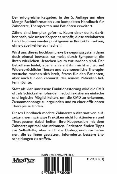 Die CMD aus neuer Sicht: Nicht die Kiefergelenke sind das Problem, sondern neuromuskuläre Fehlfunktionen mit chronische Muskelverspannungen, die jedoch allzu oft völlig unbeachtet bleiben. Verständlich beschrieben von Rainer Schöttl, D.D.S.(USA), Leiter des Institut für Temporo-Mandibuläre Regulation und ehemaliger internationaler Präsident des International College of Cranio-Mandibular Orthopedics, jetzt erweitert, vom Ratgeber zum gebundenen Handbuch für Zahnärzte, Therapeuten und Patienten. Es erklärt die Hintergründe, die zur schwammigen Definition der CMD und den wissenschaftlichen Kontroversen geführt haben, die sie umgeben. Dies resultiert nicht nur in uneinheitlichen, sondern teils gar gegensätzlichen Therapieversuchen, die manchmal eher Teil des Problems, als seiner Lösung sind.Zwischen umstrittenen Dogmen und immer mehr Werbung bei einer gleichzeitig steigenden Zahl an Betroffenen ist es heute selbst für den Fachmann sehr schwierig geworden, den roten Faden im Blick zu behalten. Statt auf Richtlinien baut dieses Handbuch auf ein individuelles Vorgehen, an dessen Anfang die Frage steht, ob im Einzelfall tatsächlich eine Dysfunktion im Kausystem vorliegt, denn die typischen Symptome können ebenso auf andere Ursachen zurückgehen. Die weiteren Schritte, von Möglichkeiten zur Diagnose über die initiale Therapie bis hin zur Korrektur von Fehlbissen mit individuell hergestellten Behelfen, bauen in logischer Folge aufeinander auf.Leseproben zu den einzelnen Kapiteln finden sich im Blog des Autors unter www.biteblog.de/autor/. Seine Facebook Seite findet man unter @biteblog.de, auf Twitter kann man ihm unter @CMD_Therapie folgen.Patienten erhalten detaillierte Anleitungen zur Selbsthilfe, z. B. Selbstmassage und zum Umgang mit Beißkissen, wie Aqualizer, Aquasplint mini und FreeBite. Zahnärzte erhalten Tipps, wie sie die CMD aus einem anderen Blickwinkel heraus betrachten und therapieren können, nämlich dem der neuromuskulären Funktion. Auch Therapeuten helfen die Fachinformationen dabei, die CMD besser zu verstehen, besser zu behandeln und sich dabei besser mit dem Zahnarzt abzustimmen.Obwohl einige Kapitel gekürzt wurden, ist so viel Neues hinzugekommen, dass sich die Seitenzahl seit der vorherigen Auflage als Taschenbuch verdoppelt hat. Aus einem Ratgeber ist so ein Handbuch geworden, in dem man Fragestellungen rund um die CMD immer wieder nachschlagen kann.