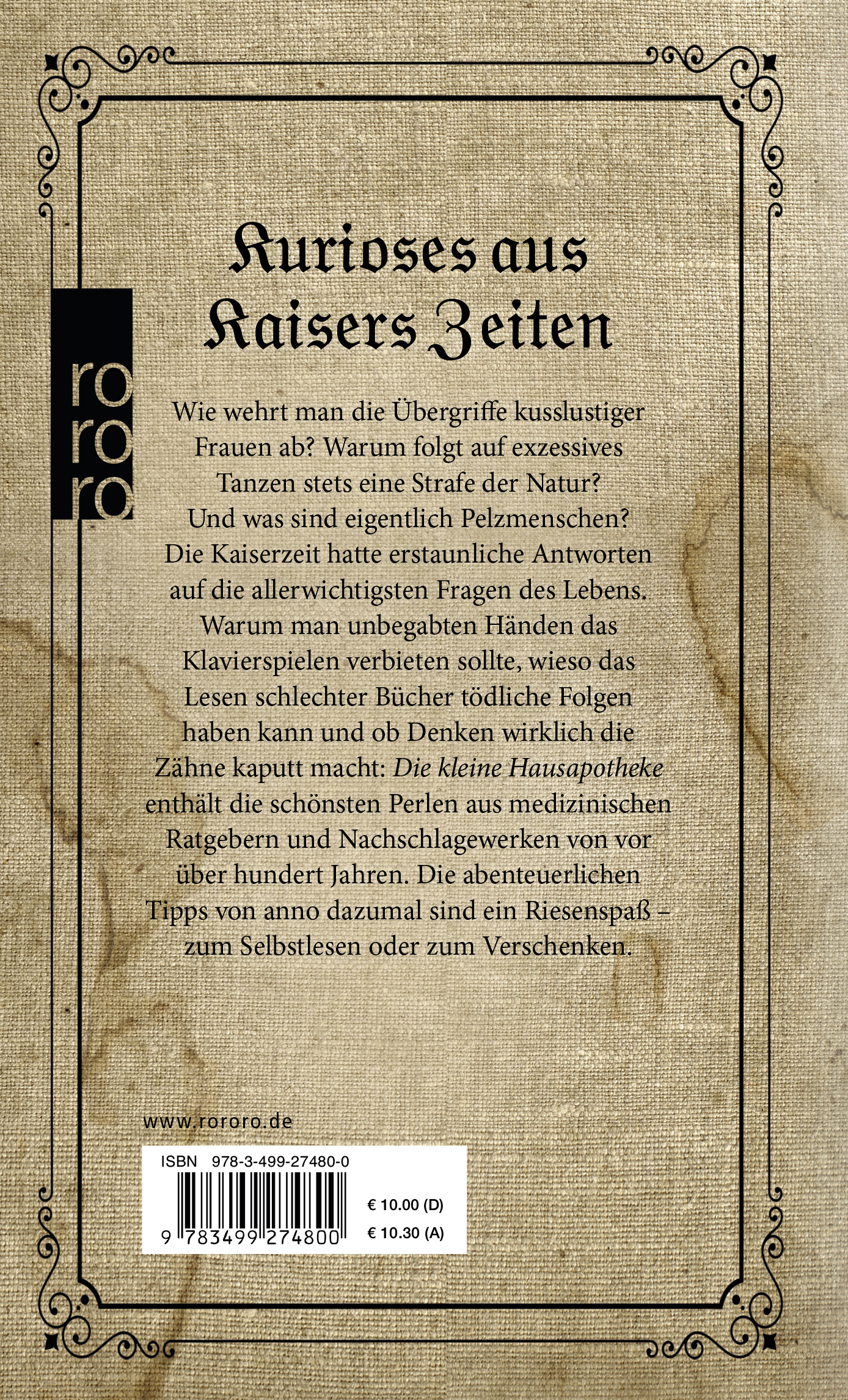 Ein charmantes Buch über das kuriose medizinische Wissen der deutschen Kaiserzeit. Hochwertig ausgestattet und mit zahlreichen Abbildungen. Wie wehrt man die Übergriffe kusslustiger Frauen ab? Warum folgt auf exzessives Tanzen stets eine Strafe der Natur? Und was sind eigentlich Pelzmenschen? Die Kaiserzeit hatte erstaunliche Antworten auf die allerwichtigsten Fragen des Lebens. Warum man unbegabten Händen das Klavierspielen verbieten sollte, wieso das Lesen schlechter Bücher tödliche Folgen haben kann und ob Denken wirklich die Zähne kaputt macht: Die kleine Hausapotheke enthält die schönsten Perlen aus medizinischen Ratgebern und Nachschlagewerken von vor über hundert Jahren. Die abenteuerlichen Tipps von anno dazumal sind ein Riesenspaß - zum selbst Lesen oder zum Verschenken.