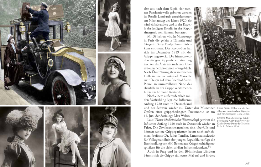 Rechtzeitig zum 100. Gedenkjahr legt Medizinhistoriker Harald Salfellner einen bilderreichen Band vor, der die Seuche nicht nur in ihren globalen Zusammenhängen veranschaulicht. In 30 Kapiteln schildert der Autor die unklaren Ursprünge, den Verlauf der einzelnen Wellen und das Krankheitsbild der gefürchteten Lungenentzündungen, denen die Ärzte damals weitgehend hilflos gegenüberstehen, das qualvolle Sterben junger Zivilisten und Soldaten, das Verröcheln der Mütter mit dem Säugling im Arm. Salfellner macht die Menschen hinter den anonymen Schreckenszahlen sichtbar.