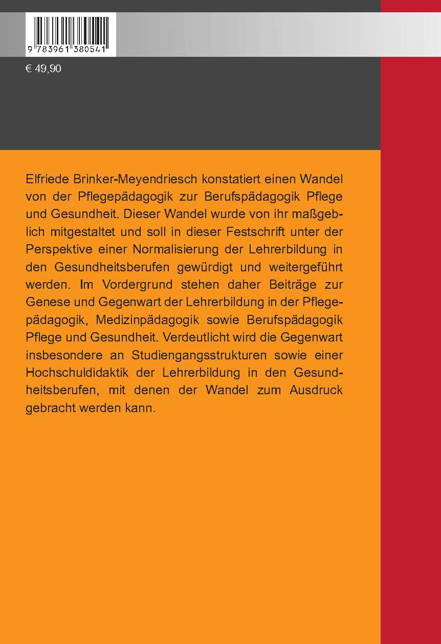 Elfriede Brinker-Meyendriesch konstatiert einen Wandel von der Pflegepädagogik zur Berufspädagogik Pflege und Gesundheit. Dieser Wandel wurde von ihr maßgeblich mitgestaltet und soll in dieser Festschrift unter der Perspektive einer Normalisierung der Lehrerbildung in den Gesundheitsberufen gewürdigt und weitergeführt werden. Im Vordergrund stehen daher Beiträge zur Genese und Gegenwart der Lehrerbildung in der Pflegepädagogik, Medizinpädagogik sowie Berufspädagogik Pflege und Gesundheit. Verdeutlicht wird die Gegenwart insbesondere an Studiengangsstrukturen sowie einer Hochschuldidaktik der Lehrerbildung in den Gesundheitsberufen, mit denen der Wandel zum Ausdruck gebracht werden kann.