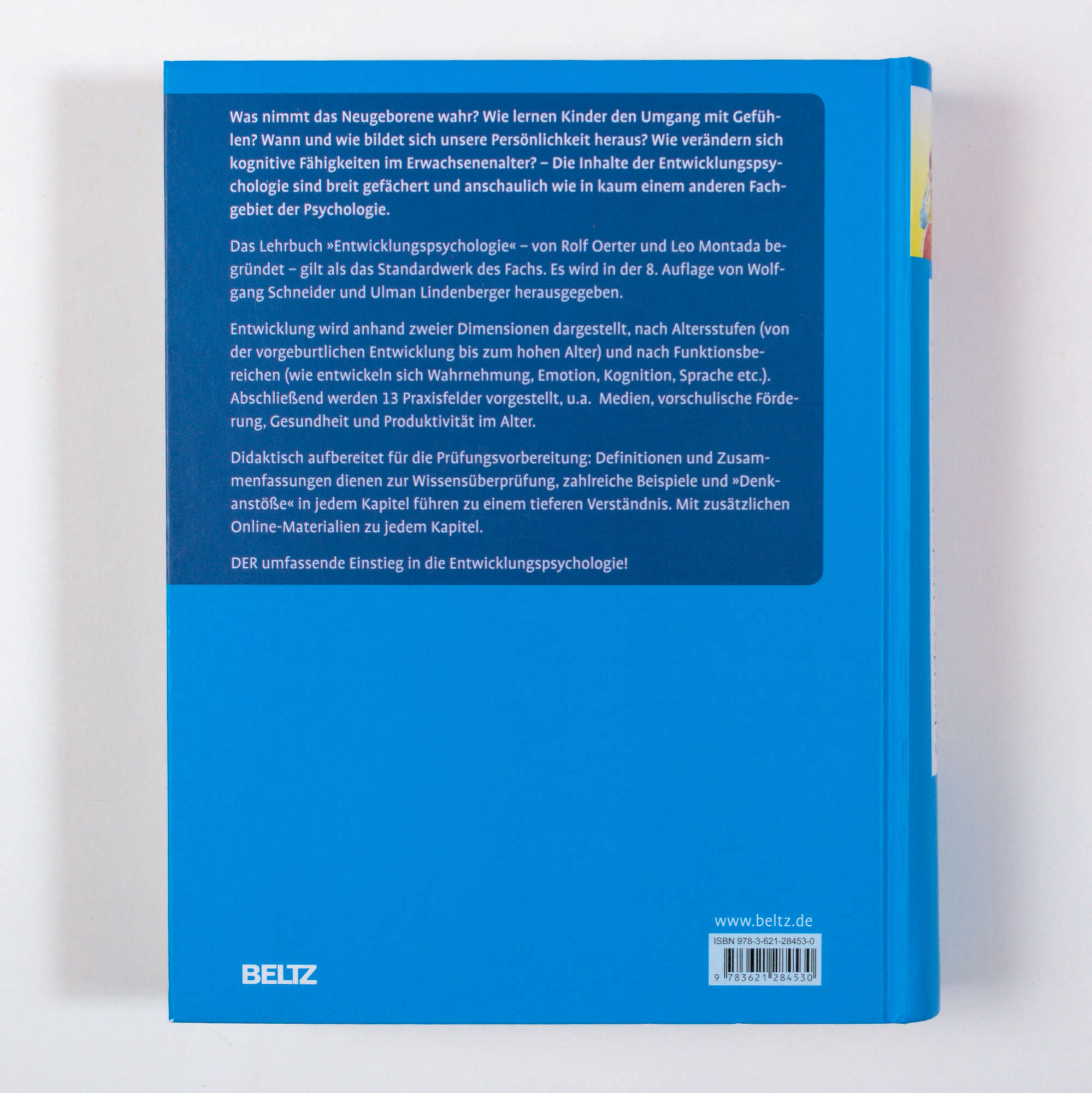 Das bewährte Lehrbuch für das Studium der Psychologie »Entwicklungspsychologie« – begründet von Rolf Oerter und Leo Montada – gilt als das Standardwerk des Fachs. Es wird in der 8. Auflage von Wolfgang Schneider und Ulman Lindenberger herausgegeben, nun in überarbeiteter Version. Themen wie Migration, Resilienz und Kultur sind nicht neu, wurden jedoch stärker einbezogen.