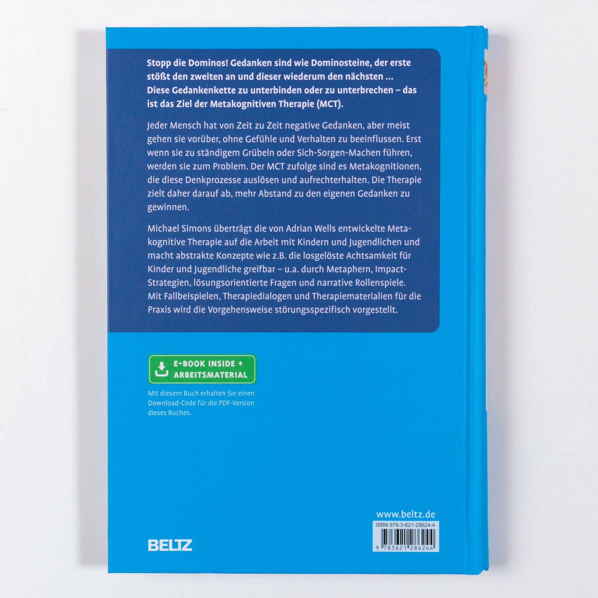 Emotionaler Stress entsteht demnach weniger durch die Inhalte von Gedanken als vielmehr durch die Art und Weise, wie Menschen auf negative Gedanken und Glaubenssätze reagieren (z.B. durch Grübeln oder Sich-Sorgen). Ziel der metakognitiven Therapie ist es, mehr Abstand zu den eigenen gedanklichen Prozessen einzunehmen. Michael Simons überträgt diesen Ansatz erfolgreich auf die Behandlung von Kindern und Jugendlichen. Nach einer Einleitung in die Prinzipien der MCT folgt ein störungsspezifischer Teil mit Fallbeispielen, Therapiedialogen und Materialien. Behandelt werden Angststörungen, Depression, Posttraumatische Belastungsstörungen und Trauerreaktionen, Zwangsstörungen und Psychosomatische Beschwerden (z.B. Bauch- und Kopfschmerzen). Im Arbeitsmaterial finden sich Fragebögen und Anleitungen für die therapeutische Praxis.