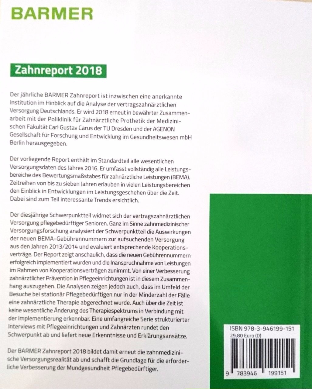 Der jährliche BARMER Zahnreport ist inzwischen eine anerkannte Institution im Hinblick auf die Analyse der vertragszahnärztlichen Versorgung Deutschlands. Er wird 2018 erneut in bewährter Zusammenarbeit der Poliklinik für Zahnärztliche Prothetik der Medizinischen Fakultät Carl Gustav Carus der TU Dresden und der AGENON Gesellschaft für Forschung und Entwicklung im Gesundheitswesen mbH Berlin herausgegeben.