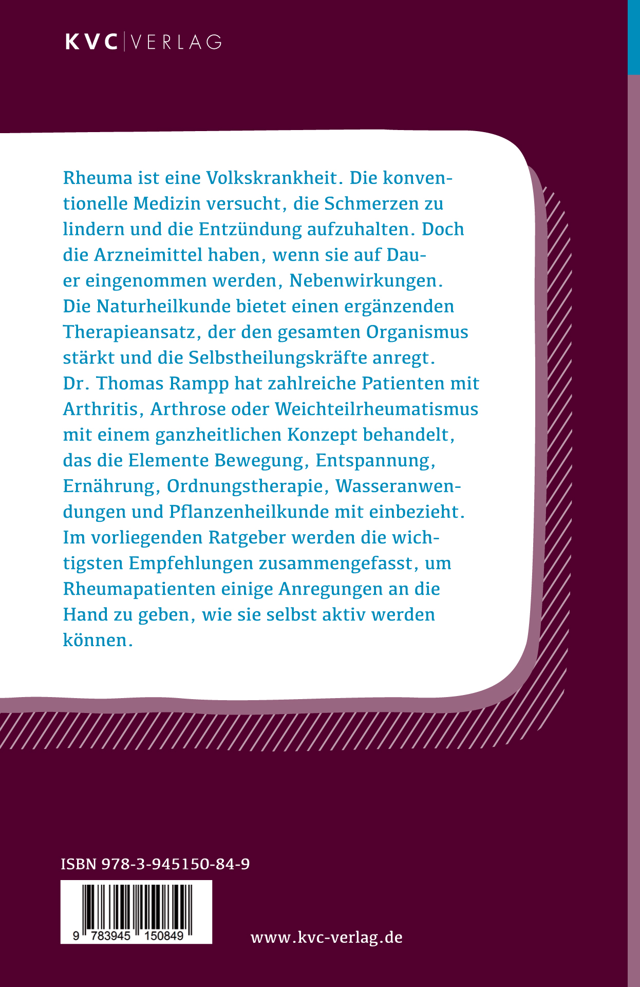 Rheuma ist eine Volkskrankheit. Die konventionelle Medizin versucht, die Schmerzen zu lindern und die Entzündung aufzuhalten. Doch die Arzneimittel haben, wenn sie auf Dauer eingenommen werden, Nebenwirkungen.Die Naturheilkunde bietet einen ergänzenden Therapieansatz, der den gesamten Organismus stärkt und die Selbstheilungskräfte anregt. Dr. Thomas Rampp hat zahlreiche Patienten mit Arthritis, Arthrose oder Weichteilrheumatismus mit einem ganzheitlichen Konzept behandelt, das die Elemente Bewegung, Entspannung, Ernährung, Ordnungstherapie, Wasseranwendungen und Pflanzenheilkunde mit einbezieht.Im vorliegenden Ratgeber werden die wichtigsten Empfehlungen zusammengefasst, um Rheumapatienten einige Anregungen an die Hand zu geben, wie sie selbst aktiv werden können.