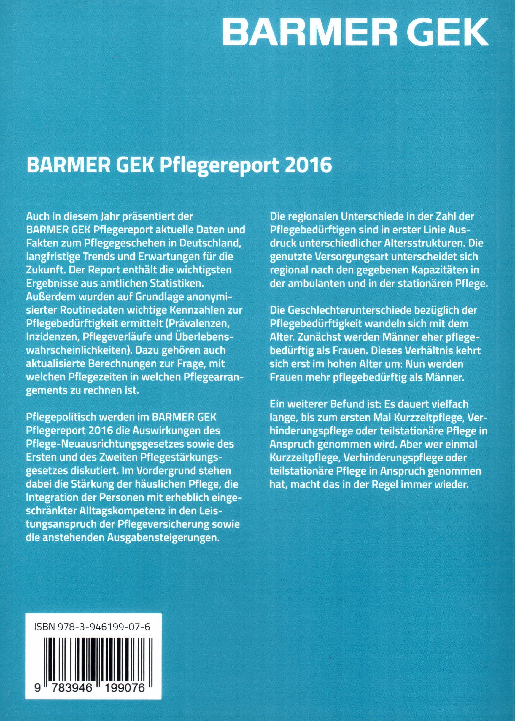Auch in diesem Jahr präsentiert der BARMER GEK Pflegereport aktuelle Daten und Fakten zum Pflegegeschehen in Deutschland, langfristige Trends und Erwartungen für die Zukunft. Der Report enthält die wichtigsten Ergebnisse aus amtlichen Statistiken. Außerdem wurden auf Grundlage anonymisierter Routinedaten wichtige Kennzahlen zur Pflegebedürftigkeit ermittelt (Prävalenzen, Inzidenzen, Pflegeverläufe und Überlebenswahrscheinlichkeiten). Dazu gehören auch aktualisierte Berechnungen zur Frage, mit welchen Pflegezeiten in welchen Pflegearrangements zu rechnen ist. Pflegepolitisch werden im BARMER GEK Pflegereport 2016 die Auswirkungen des Pflege-Neuausrichtungsgesetzes sowie des Ersten und des Zweiten Pflegestärkungsgesetzes diskutiert. Im Vordergrund stehen dabei die Stärkung der häuslichen Pflege, die Integration der Personen mit erheblich eingeschränkter Alltagskompetenz in den Leistungsanspruch der Pflegeversicherung sowie die anstehenden Ausgabensteigerungen. Die regionalen Unterschiede in der Zahl der Pflegebedürftigen sind in erster Linie Ausdruck unterschiedlicher Altersstrukturen. Die genutzte Versorgungsart unterscheidet sich regional nach den gegebenen Kapazitäten in der ambulanten und in der stationären Pflege. Die Geschlechterunterschiede bezüglich der Pflegebedürftigkeit wandeln sich mit dem Alter. Zunächst werden Männer eher pflegebedürftig als Frauen. Dieses Verhältnis kehrt sich erst im hohen Alter um: Nun werden Frauen mehr pflegebedürftig als Männer. Ein weiterer Befund ist: Es dauert vielfach lange, bis zum ersten Mal Kurzzeitpflege, Verhinderungspflege oder teilstationäre Pflege in Anspruch genommen wird. Aber wer einmal Kurzzeitpflege, Verhinderungspflege oder teilstationäre Pflege in Anspruch genommen hat, macht das in der Regel immer wieder.