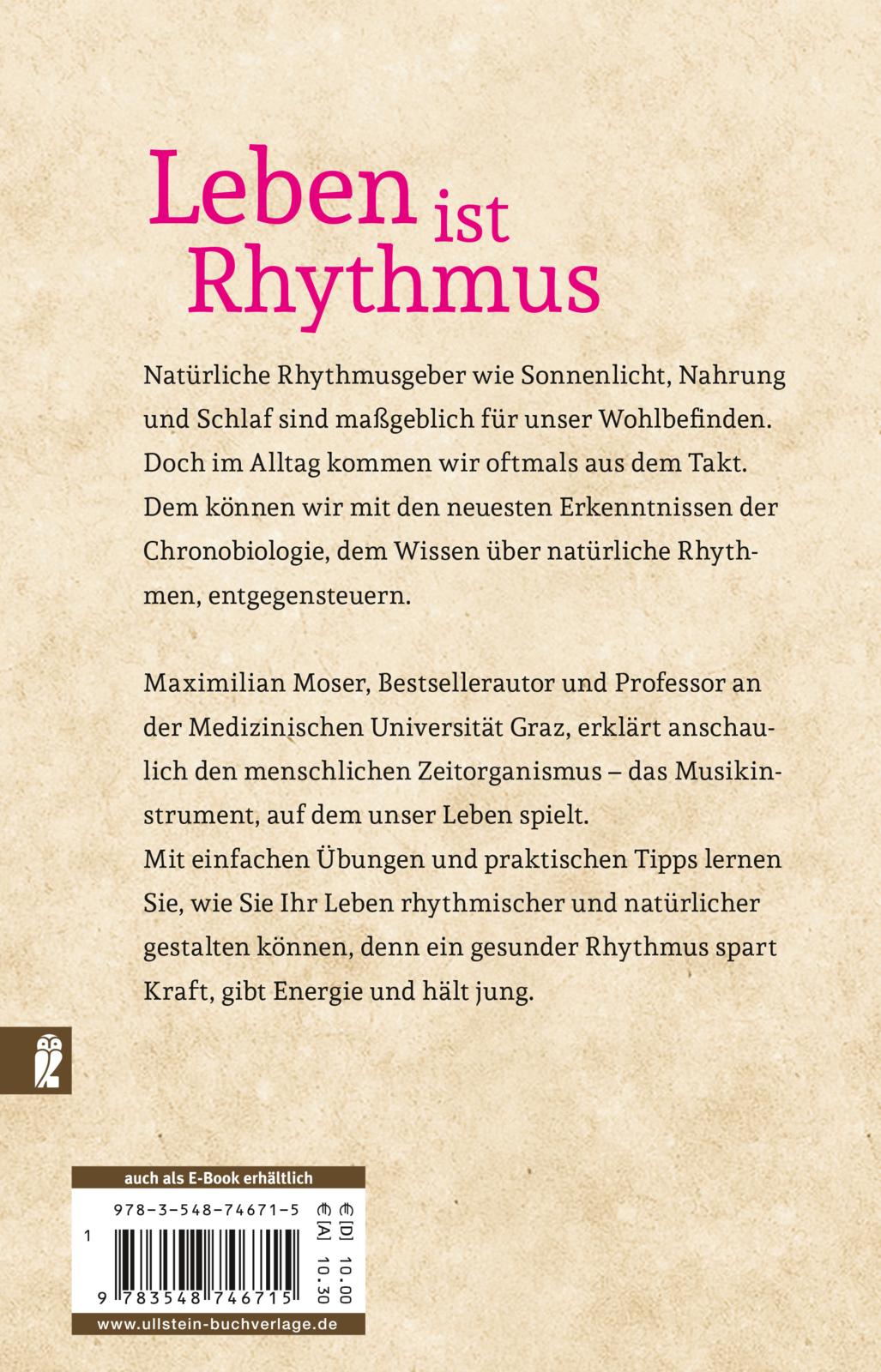 Univ.-Prof. Dr. Maximilian Moser, 1956 in Klagenfurt geboren, studierte an der Universität Graz Biologie und Medizin. Heute ist er als Chronobiologe an der Medizinischen Universität Graz tätig. Er leitet das Human Research Institut in Weiz, Österreich. In seiner langjährigen Forschungslaufbahn entwickelte er u.a. aus der Weltraummedizin neue Methoden zur Messung des vegetativen Nervensystems. Über von ihm geleitete Projekte haben internationale Medien, darunter der ORF, das ZDF, Nano, aber auch das Time Magazine und die London Times, berichtet. Seine Bücher wie „Das Geheimnis der Zirbe“ und „Die sanfte Medizin der Bäume" sind erfolgreiche Longseller. www.rhythm.at