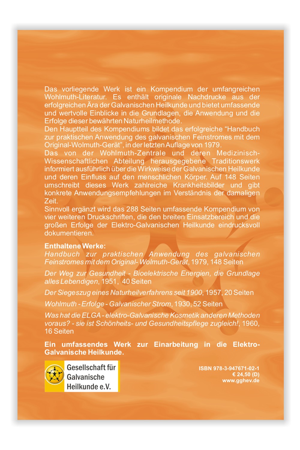 Den Hauptteil des Kompendiums bildet das erfolgreiche “Handbuch zur praktischen Anwendung des galvanischen Feinstromes mit dem Original-Wolmuth-Gerät”, in der letzten Auflage von 1979.