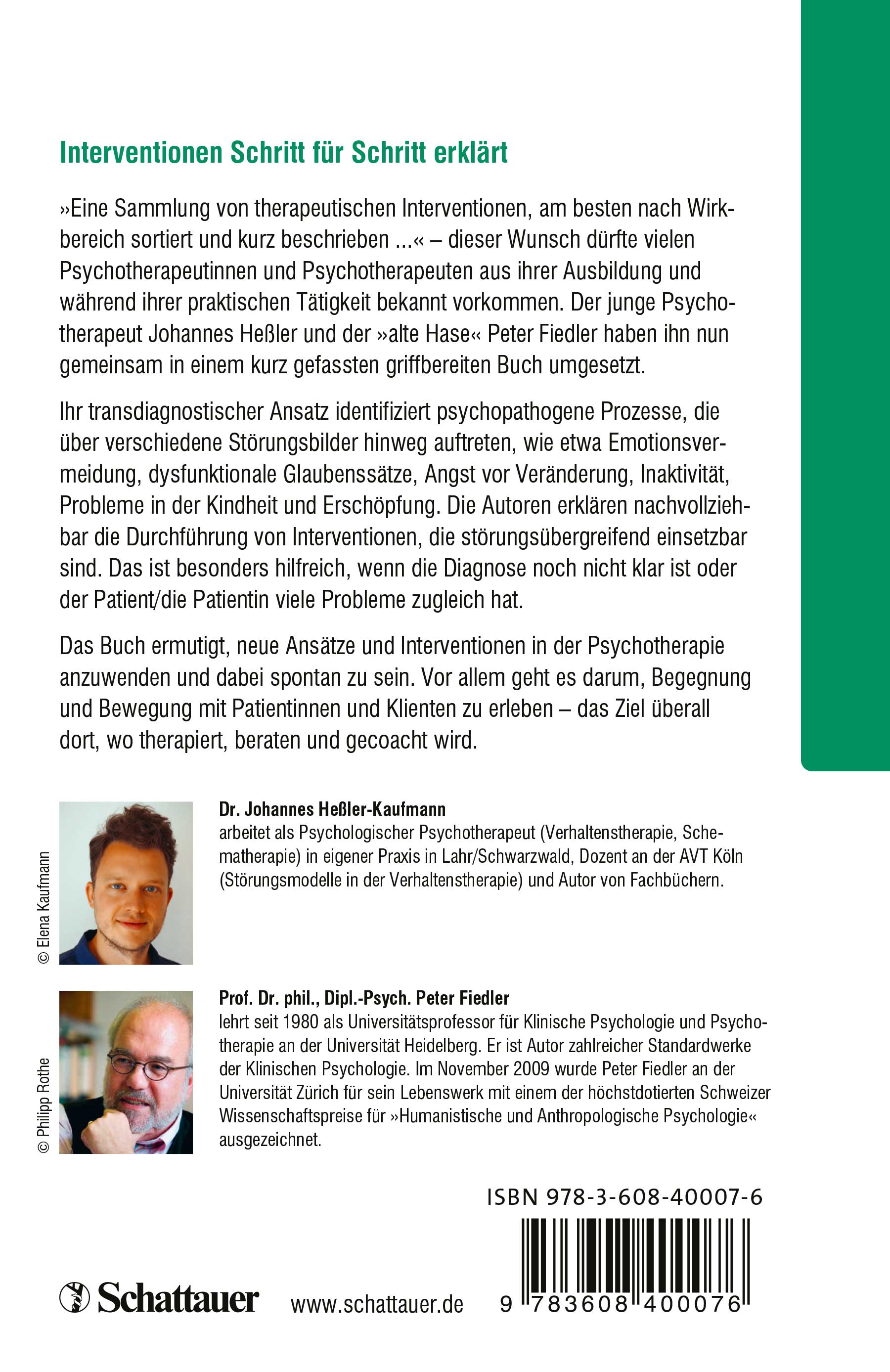 Eine Sammlung von therapeutischen Interventionen, die mir den Zugang zu den Patienten erleichtern, am besten nach Wirkbereich sortiert und kurz beschrieben ...“ – dieser Wunsch dürfte vielen Psychotherapeutinnen und Psychotherapeuten aus ihrer Ausbildung und während ihrer praktischen Tätigkeit bekannt vorkommen. Der junge Psychotherapeut Johannes B. Heßler und der renommierte „alte Hase“ Peter Fiedler haben ihn nun gemeinsam in einem kurz gefassten „griffbereiten“ Buch umgesetzt.
