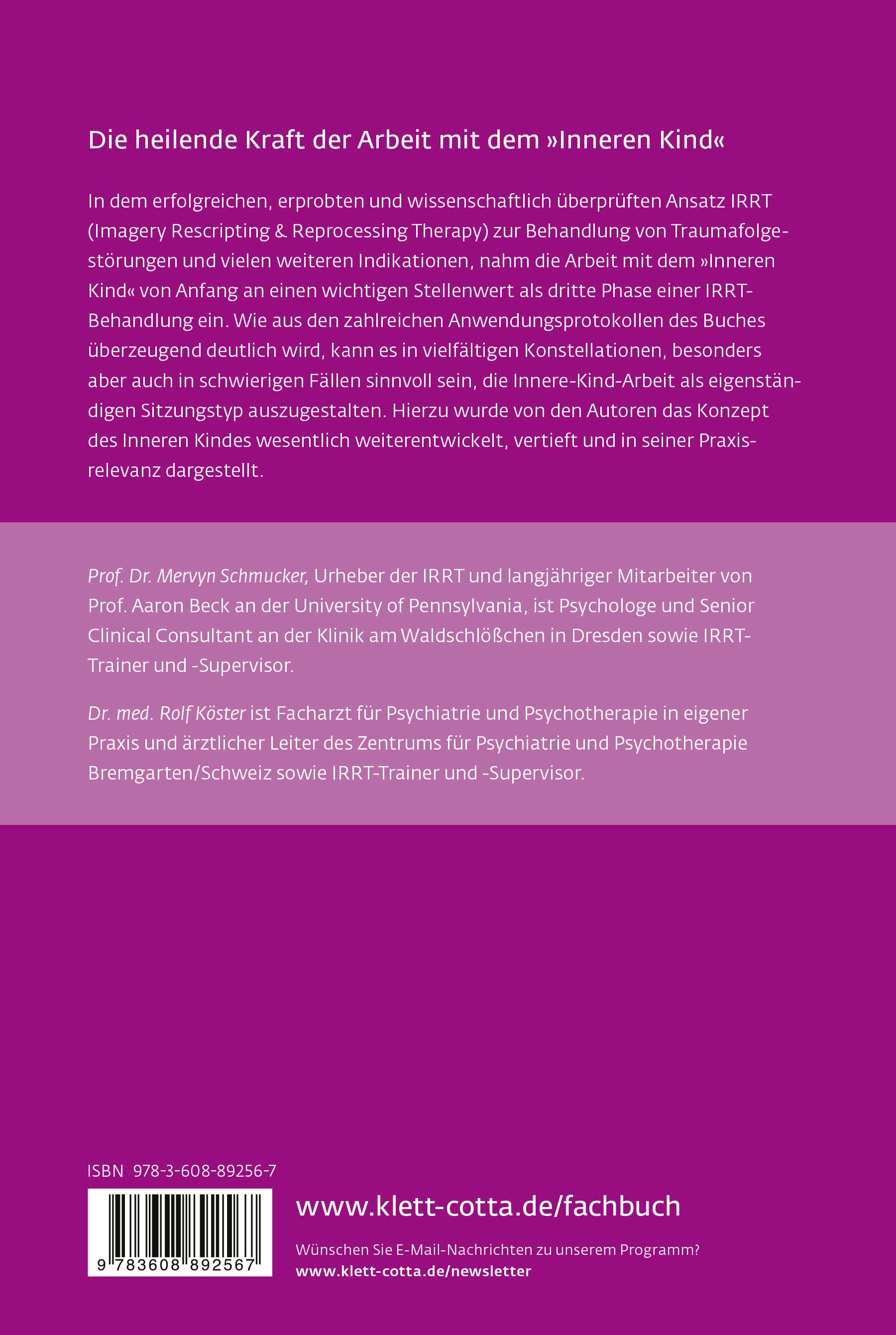 In der Imagery Rescripting & Reprocessing Therapy (IRRT) wurde die Arbeit mit dem Inneren Kind zu einem differenzierten Konzept entwickelt, ursprünglich entstanden aus der dritten Phase einer Traumakonfrontation im IRRT-Ansatz. Als eigenständige Intervention zeigt die Begegnung zwischen »Aktuellem Ich« und »Metaphorischem Inneren Kind von heute« eine treffsichere Abbildung des Verhältnisses der Patienten zu sich selbst mit einem weiten diagnostischen und therapeutischen Indikationsspektrum. Das Buch erläutert präzise das Konzept und zeigt anhand vieler ausführlicher Falldarstellungen das konkrete Vorgehen auch in problematischen Konstellationen.