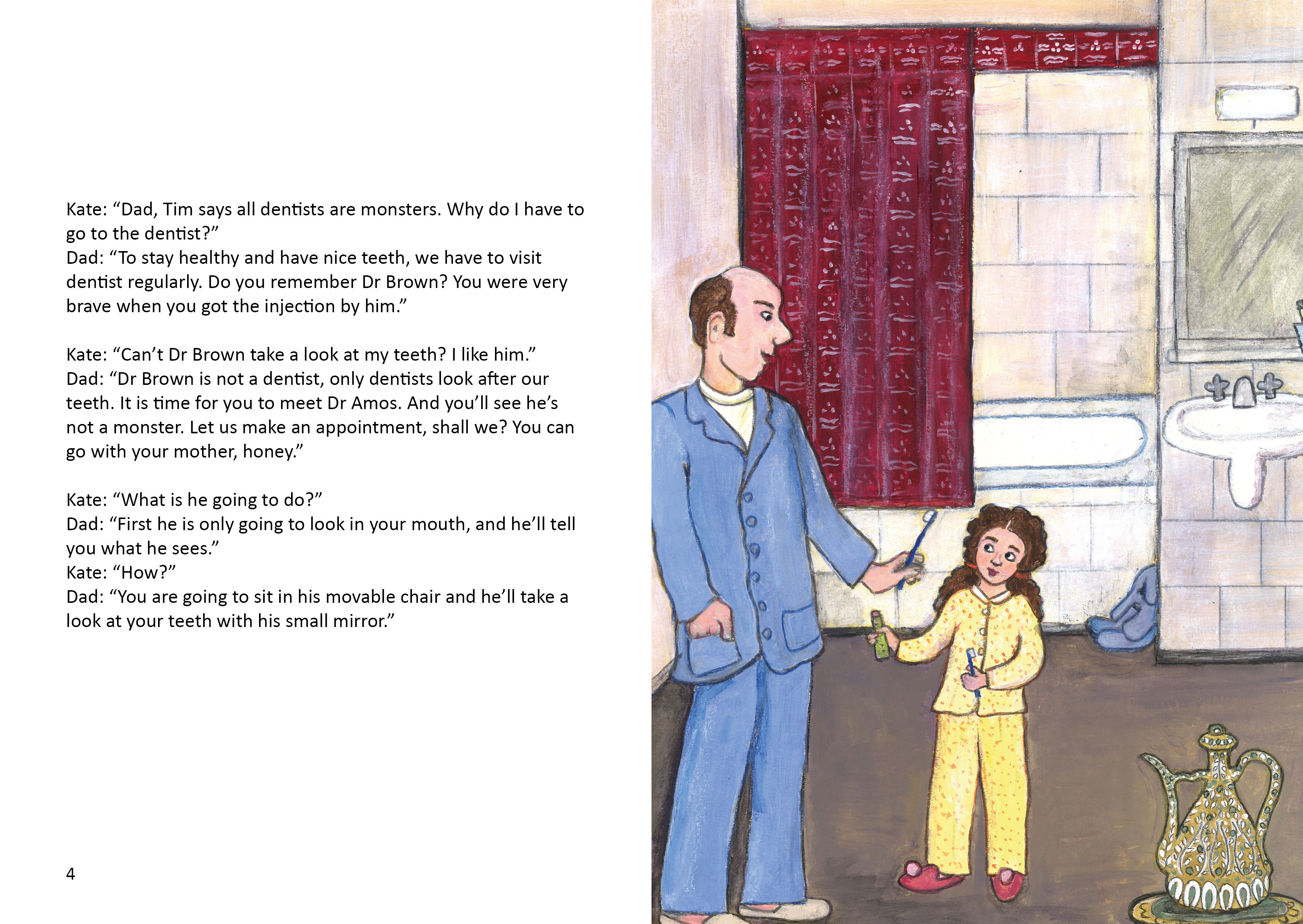 Dr. Amos kann alle Fragen, die Kate an ihn hat, perfekt beantworten. Dafür sorgt das fachliche Wissen des Autors. Wichtig in dieser Situation ist, dass der Zahnarztbesuch frei von Angstgefühlen und Belastungen stattfinden kann. Gut gemeinte Formulierungen wie „Du brauchst keine Angst haben“ oder „Es tut auch nicht weh“ bringen den Nachwuchs erst auf die Idee, dass ein Zahnarztbesuch unangenehm verlaufen könnte. Statt dessen sollte die natürliche kindliche Neugier geweckt werden. Das klappt, wenn das Kind zuvor schon spielerisch erfahren hat, wie es im inneren seines Mundes aussieht. Belohnungsgeschenke für einen tapfer überstandenen Zahnarzttermin zu versprechen, ist sicher nicht empfehlenswert. Das setzt ein Kind nur unnötig unter Druck. Der Zahnarzt in „Kate & Dr. Amos“ gibt ein gutes Beispiel, wie die erste Untersuchung ablaufen kann. Das Buch ist also bestens geeignet, um ein Kind auf spielerische Weise auf das bevorstehende Ereignis einzustimmen.
