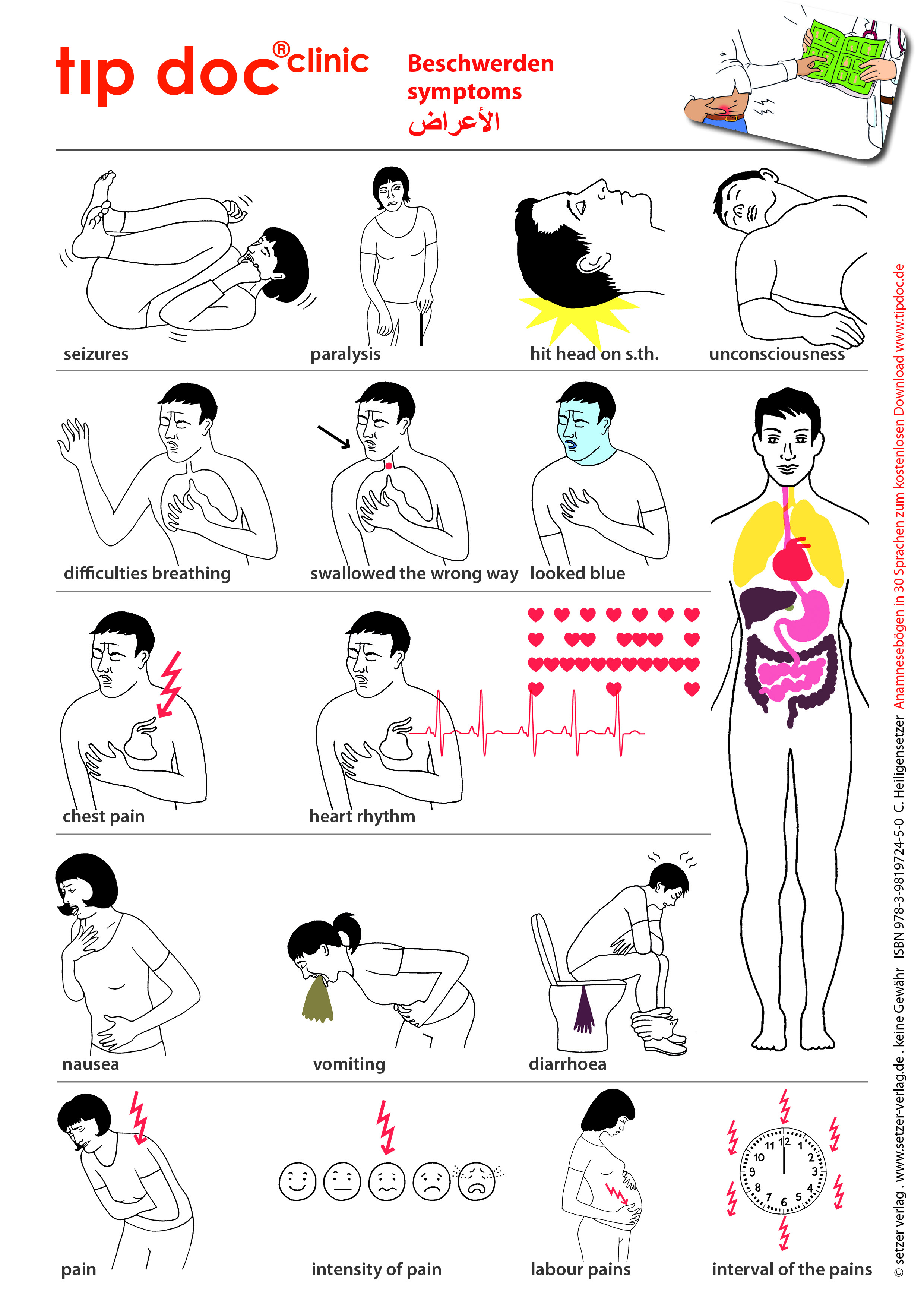19 anschauliche Bilder für die Verständigung mit fremdsprachigen Patienten zum Antippen. Abreißblock. Jedem Patienten sein eigenes Blatt. Hygienisch sicher. Thema: Beschwerden - Symptome