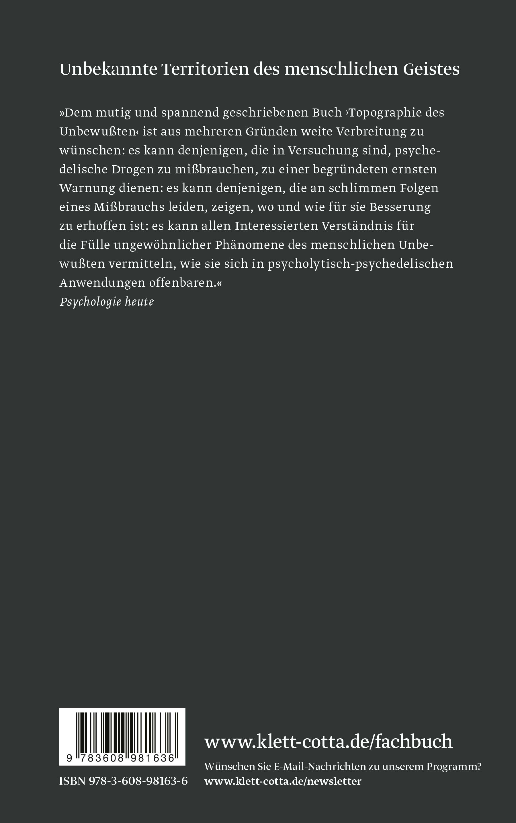 »Dem mutig und spannend geschriebenen Buch »Topographie des Unbewußtenn« ist aus mehreren Gründen weite Verbreitung zu wünschen: es kann denjenigen, die in Versuchung sind, psychedelische Drogen zu mißbrauchen, zu einer begründeten ernsten Warnung dienen: ... es kann allen Interessierten Verständnis für die Fülle ungewöhnlicher Phänomene des menschlichen Unbewußten vermitteln, wie sie sich in psycholytisch-psychedelischen Anwendungen offenbaren.«