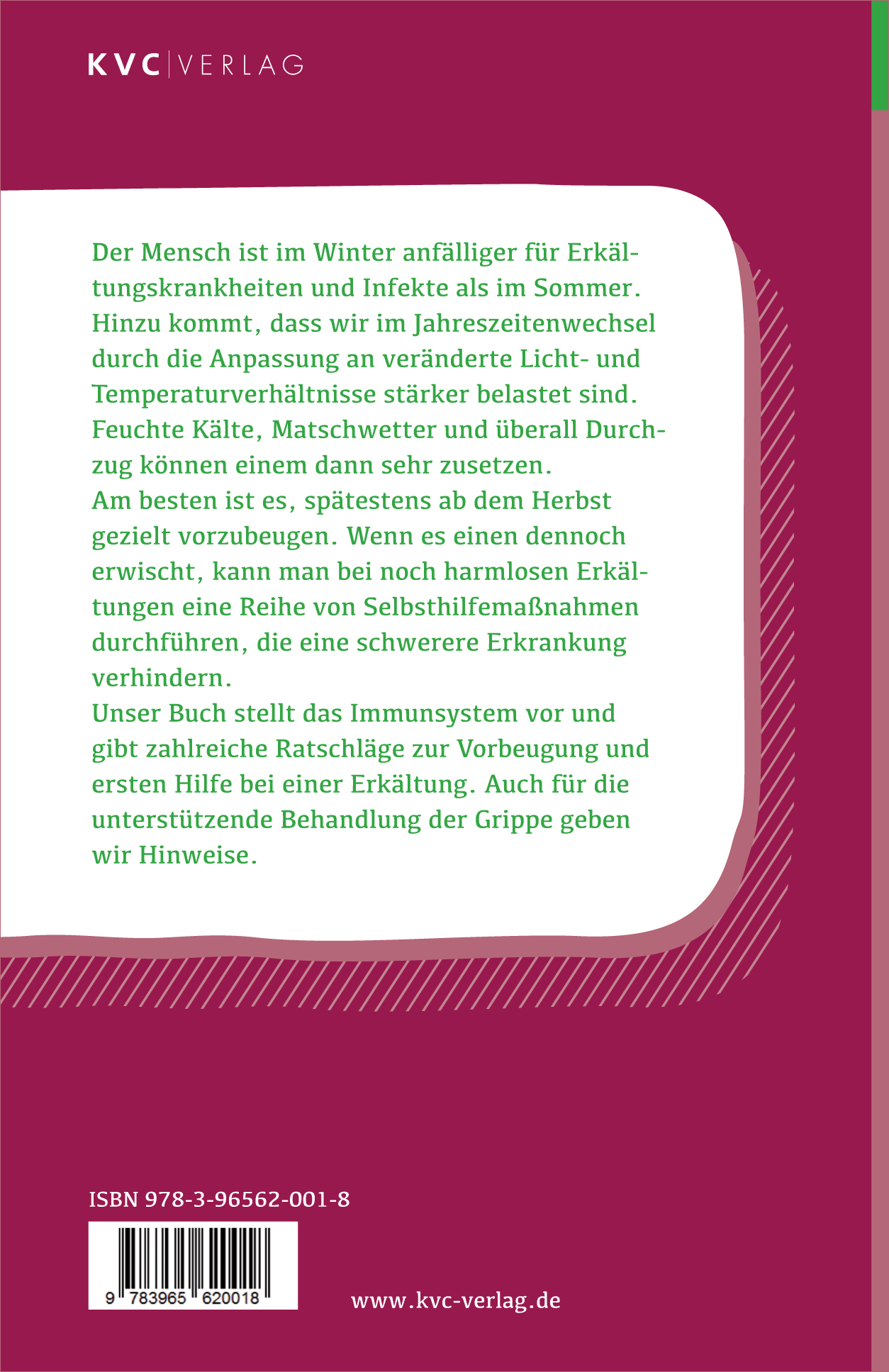 Der Mensch ist im Winter anfälliger für Erkältungskrankheiten und Infekte als im Sommer. Hinzu kommt, dass wir im Jahreszeitenwechsel durch die Anpassung an veränderte Licht- und Temperaturverhältnisse stärker belastet sind. Feuchte Kälte, Matschwetter und überall Durchzug können einem dann sehr zusetzen. Am besten ist es, spätestens ab dem Herbst gezielt vorzubeugen. Wenn es einen dennoch erwischt, kann man bei noch harmlosen Erkältungen eine Reihe von Selbsthilfemaßnahmen durchführen, die eine schwerere Erkrankung verhindern. Unser Buch stellt das Immunsystem vor und gibt zahlreiche Ratschläge zur Vorbeugung und ersten Hilfe bei einer Erkältung. Auch für die unterstützende Behandlung der Grippe geben wir Hinweise.