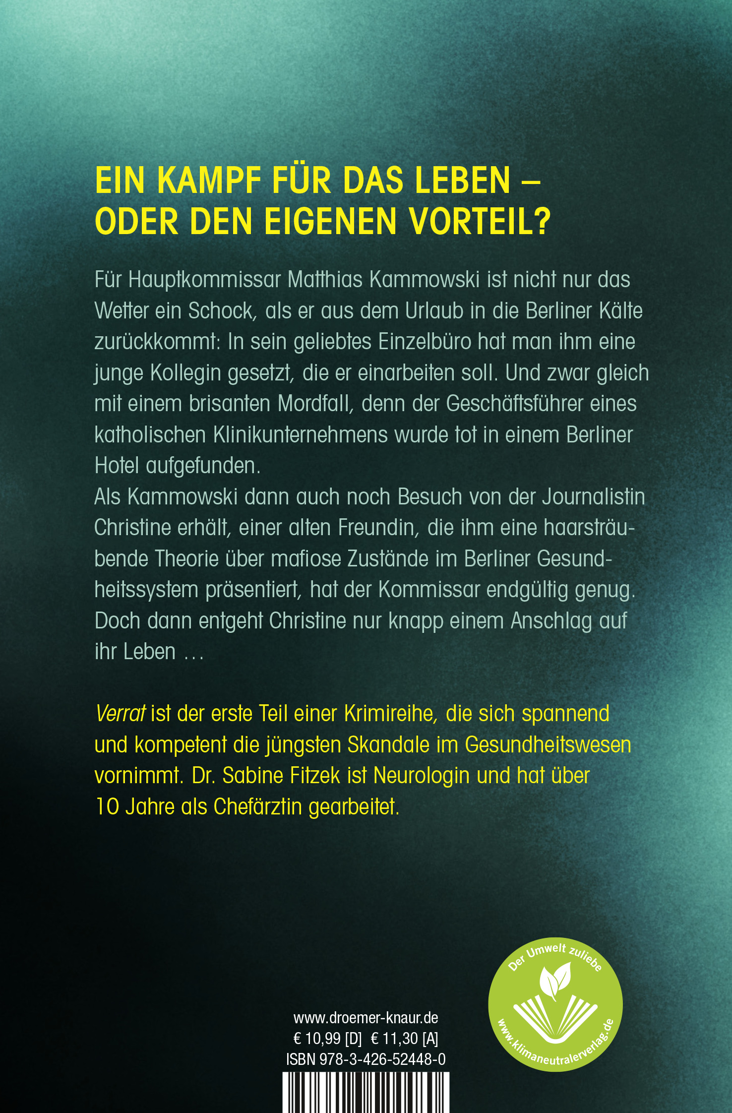 Hochspannend und beklemmend nah an der Realität: wenn ein Menschenleben zum Kostenfaktor wird. »Verrat« ist der erste Teil einer Krimi-Reihe, die sich spannend und hochkompetent die jüngsten Skandale im Gesundheitswesen vornimmt. Die Autorin Dr. Sabine Fitzek ist Neurologin und hat über 10 Jahre als Chefärztin gearbeitet. Beste Unterhaltung für Fans von Polit-Krimis und Spannungsromanen mit gesellschaftskritischem Hintergrund.