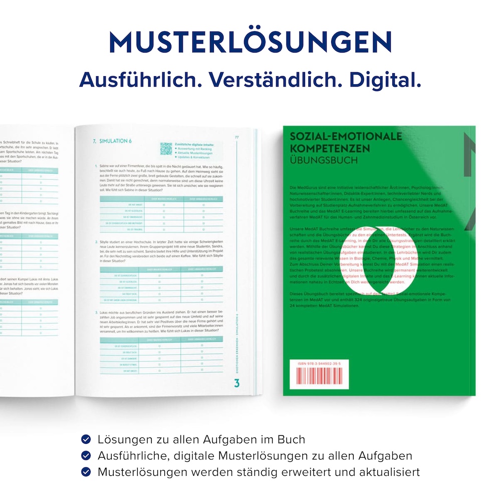 | Schlagworte | Alternative Heilmethoden • Aufnahmeprüfung • Aufnahmeverfahren • Eignungstest • Emotionen Erkennen • Humanmedizin • Hypnotherapie • Leitfaden • Lernskript • MedAT 2019 • medat 2020 • medat 2020 vorbereitung • medat 2022 • MedAT 2024 • MedAT 2024 Vorbereitung • medat buch • MEDAT-H • MedAT-Skripten • MedAT Vorbereitung • MedAT-Z • MedGurus • Medizin • Medizin-Aufnahmetest • Medizinertest • Medizin-Studenten • Medizin-Studium • Medizinstudium Österreich • Online-Zugang • Philosophie der Logik • sozial-emotionale Kompetenzen • Soziales Entscheiden • Testfragen • Übungen • Zahnärztliche Chirurgie • Zahnmedizin |