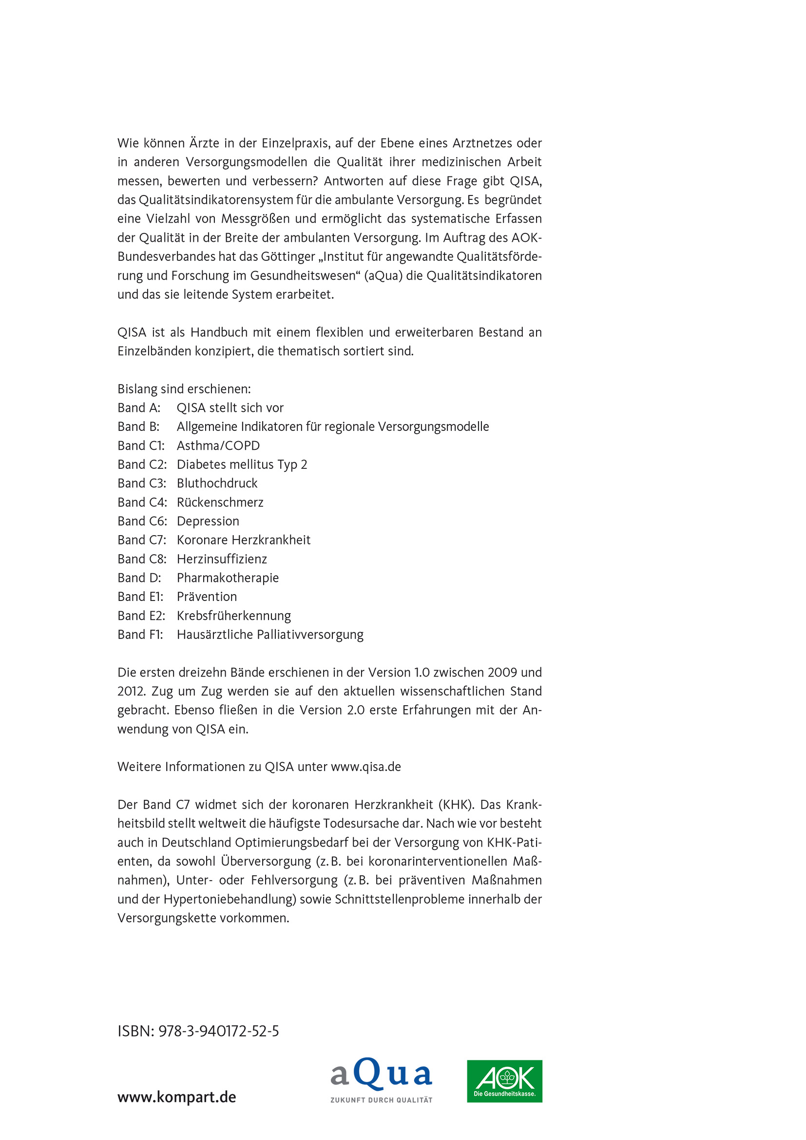 Die Koronare Herzkrankheit (KHK) ist eine der häufigsten Todesursachen in Deutschland. Es gibt weitgehende Evidenz über eine Überversorgung in der invasiven Diagnostik und Therapie bei gleichzeitiger Unterversorgung in der Primär- und Sekundärprävention. Insbesondere die Möglichkeiten der Patientenaufklärung und der Motivation zu Verhaltensänderungen werden noch zu wenig ausgeschöpft. Das QISA-Indikatorenset zielt auf die Identifizierung von Risikofaktoren, die individuelle Patientenberatung sowie die Diagnose und Behandlung der manifesten KHK.