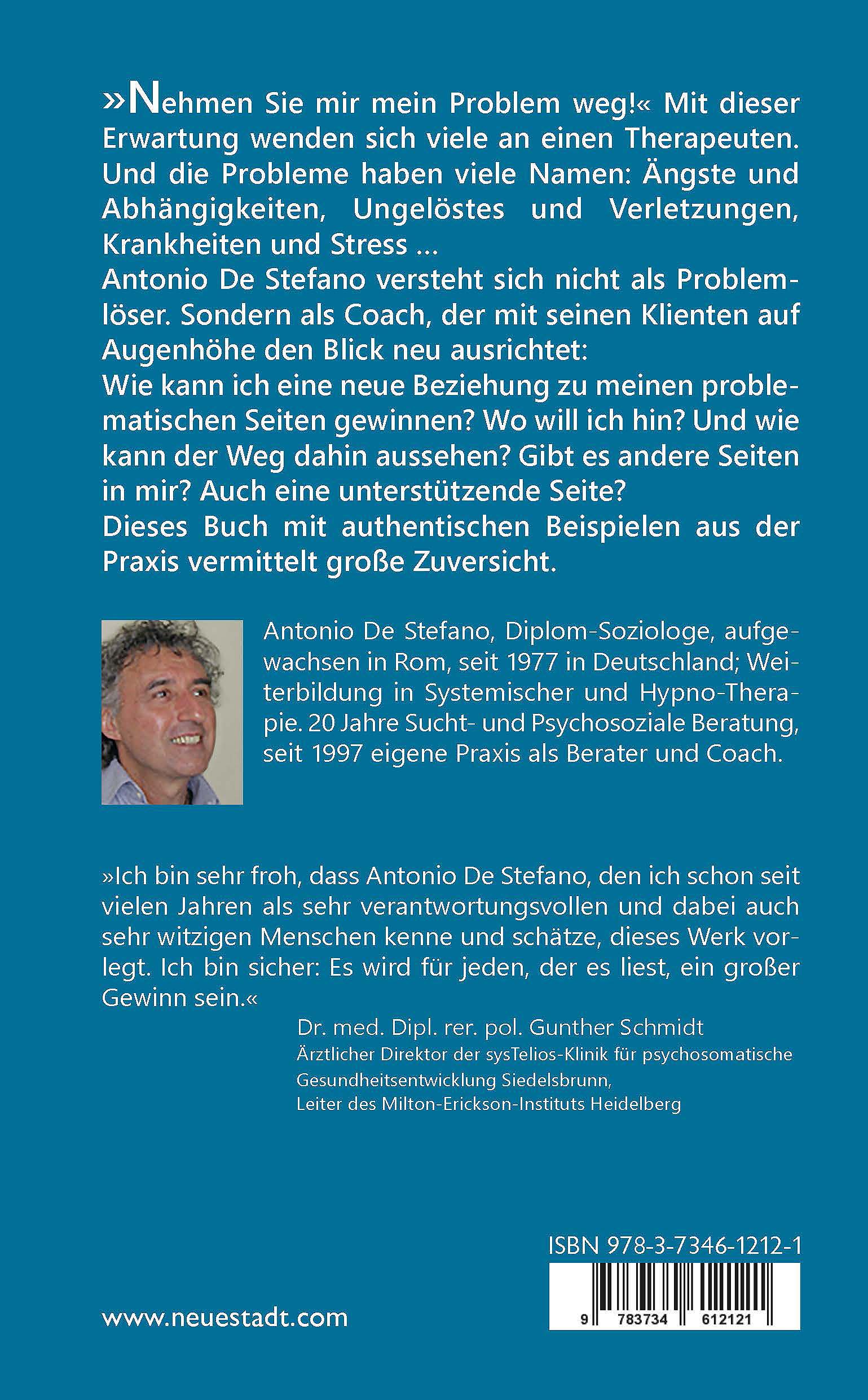 Antonio De Stefano, Diplom-Soziologe, aufgewachsen in Rom, seit 1977 in Deutschland; Weiterbildung in Systemischer und Hypno-Therapie.20 Jahre Sucht- und Psychosoziale Beratung, seit 1997 eigene Praxis als Berater und Coach.