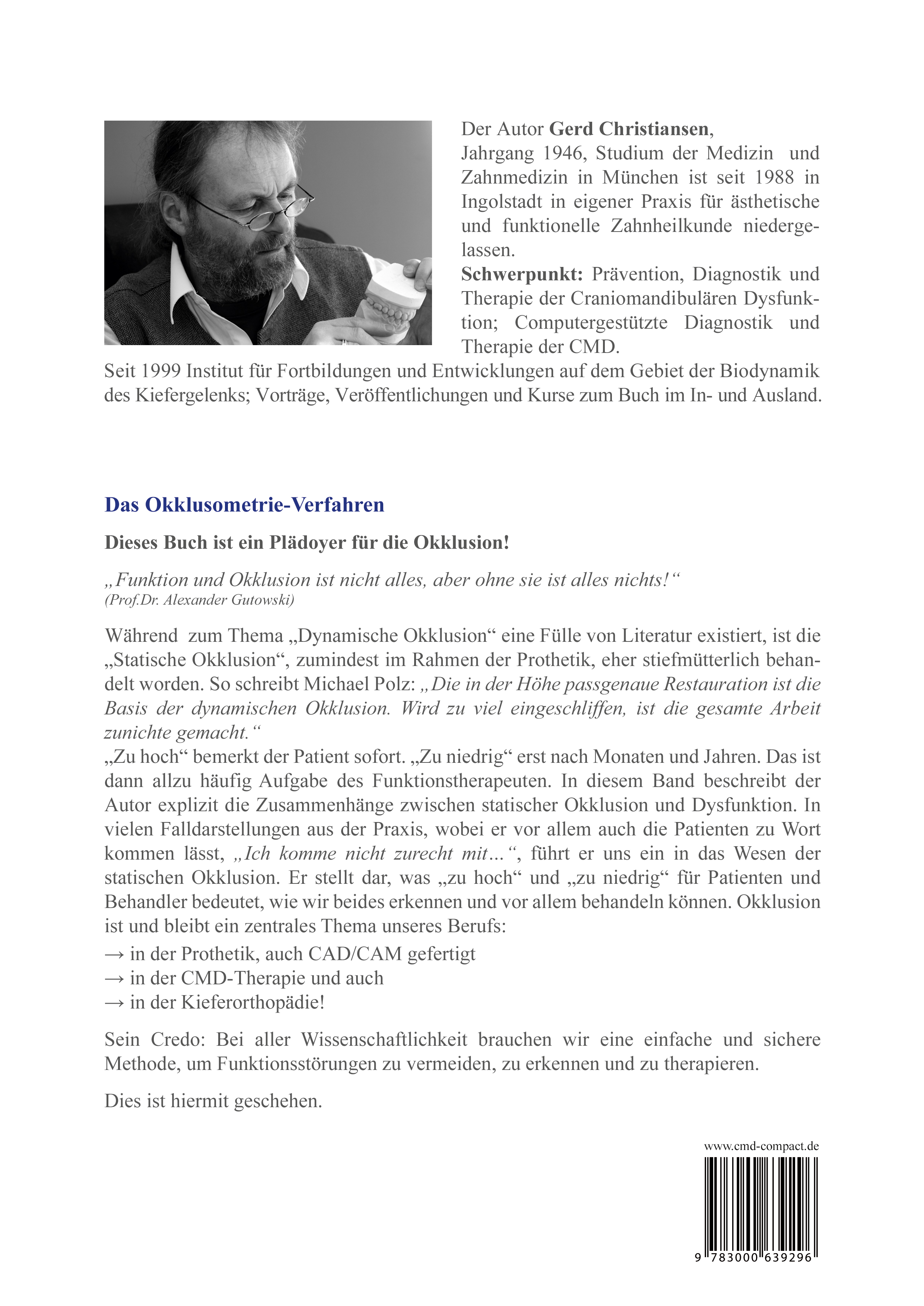 Der Autor Gerd Christiansen, Jahrgang 1946, Studium der Medizin und Zahnmedizin in München ist seit 1988 in Ingolstadt in eigener Praxis für ästhetische und funktionelle Zahnheilkunde niedergelassen. Schwerpunkt: Prävention, Diagnostik und Therapie der Craniomandibulären Dysfunktion, Computergestützte Diagnostik und Therapie der CMD. Seit 1999 Institut für Fortbildungen und Entwicklungen auf dem Gebiet der Biodynamik des Kiefergelenks, Vorträge, Veröffentlichungen und Kurse zum Buch im In- und Ausland