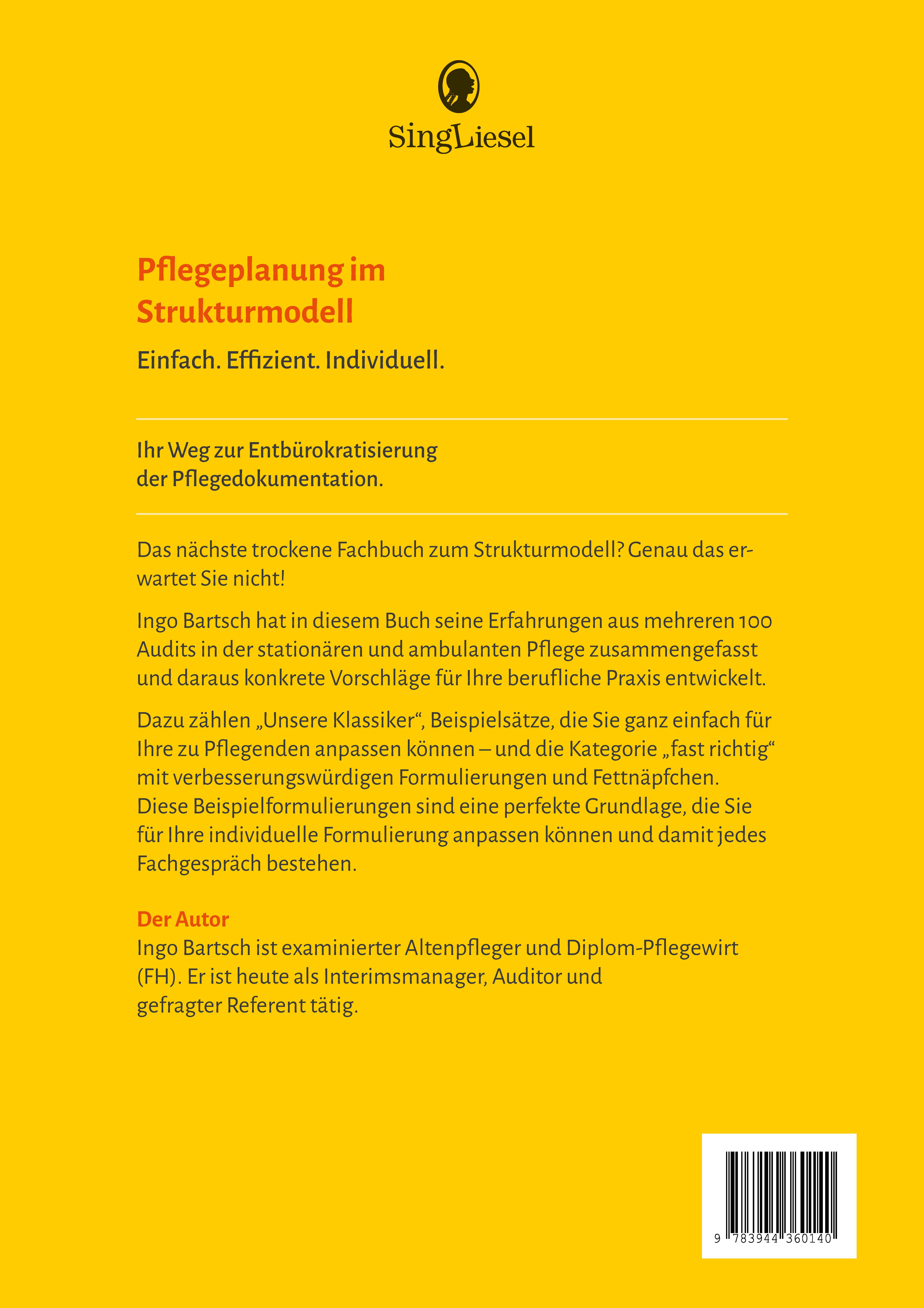 Pflegeplanung im Strukturmodell. Einfach. Effizient. Individuell.Ihr Weg zur Entbürokratisierung der Pflegedokumentation.Das nächste trockene Fachbuch zum Strukturmodell? Genau das erwartet Sie nicht!Ingo Bartsch hat in diesem Buch seine Erfahrungen aus mehreren 100 Audits in der stationären und ambulanten Pflege zusammengefasst und daraus konkrete Vorschläge für Ihre berufliche Praxis entwickelt.Dazu zählen "Unsere Klassiker", Beispielsätze, die Sie ganz einfach für Ihre zu Pflegenden anpassen können - und die Kategorie "fast richtig" mit verbesserungswürdigen Formulierungen und Fettnäpfchen.Diese Beispielformulierungen sind eine perfekte Grundlage, die Sie für Ihre individuelle Formulierung anpassen können und damit jedes Fachgespräch bestehen.Pflegedokumentation so einfach wie möglich. Konkrete Handlungsanleitungen für eine einfache und individuelle Pflegeplanung. Mit sofort umsetzbaren Tipps.Seit November 2019 gilt die neue Qualitätsprüfungsrichtlinie (QPR). Die interne Qualitätssicherung, die externe Qualitätsprüfung und die Qualitätsdarstellung wurden dabei grundlegend neu gestaltet.Dieses Buch enthält konkrete Handlungsanleitungen, wie Sie einfach und individuell eine Pflegeplanung im Strukturmodell beschreiben könnnen.Im Mittelpunkt stehen Effizienz und Zeitersparnis: mit möglichst wenig Aufwand das beste Ergebnis erzielen.