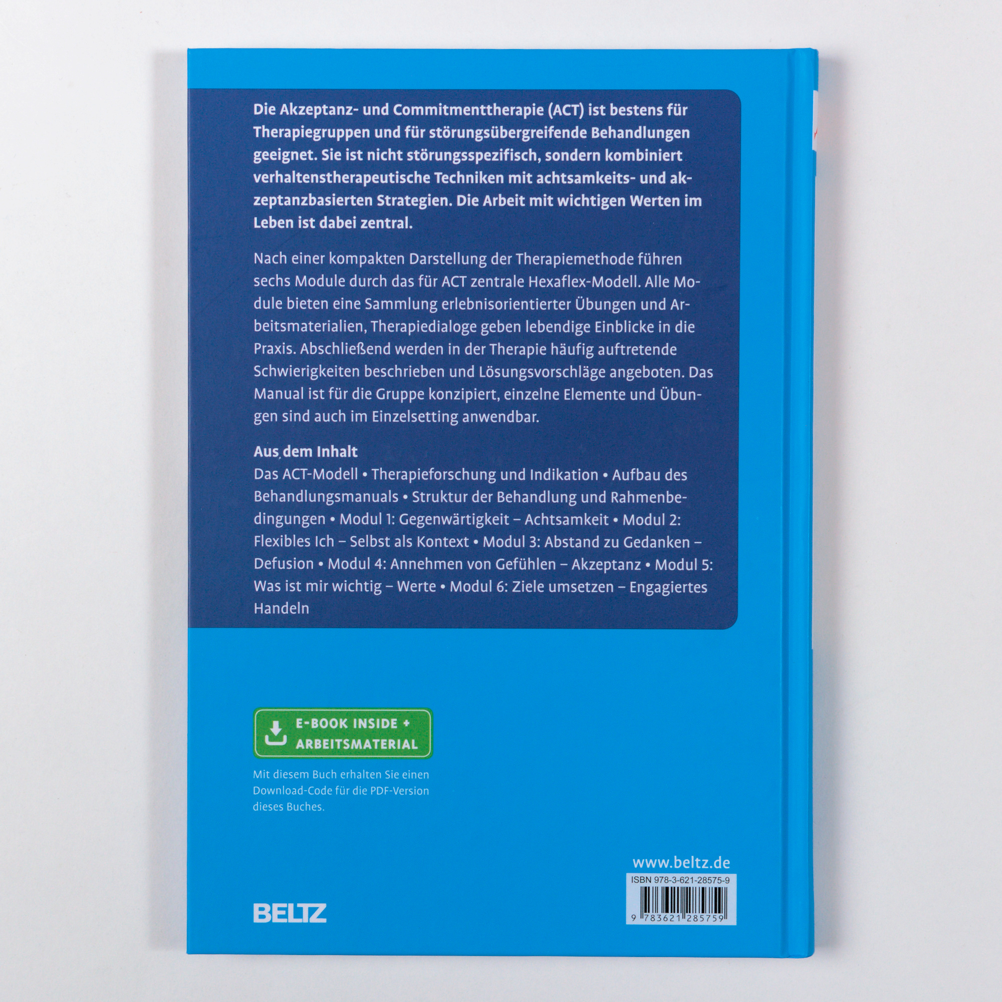 Dieses bislang einzige Gruppenmanual zu ACT bietet eine kompakte theoretische Einführung in diese Therapiemethode und gliedert sich in sechs Module, die sich an dem für ACT zentralen Hexaflex-Modell orientieren. Zu jedem Modul gibt es erlebnisorientierte Übungen und Arbeitsmaterialien, auch werden häufig auftretende Schwierigkeiten in der Therapie mit Lösungsvorschlägen beschrieben. Das Manual ist für die Gruppe konzipiert, einzelne Elemente und Übungen sind auch im Einzelsetting einsetzbar.