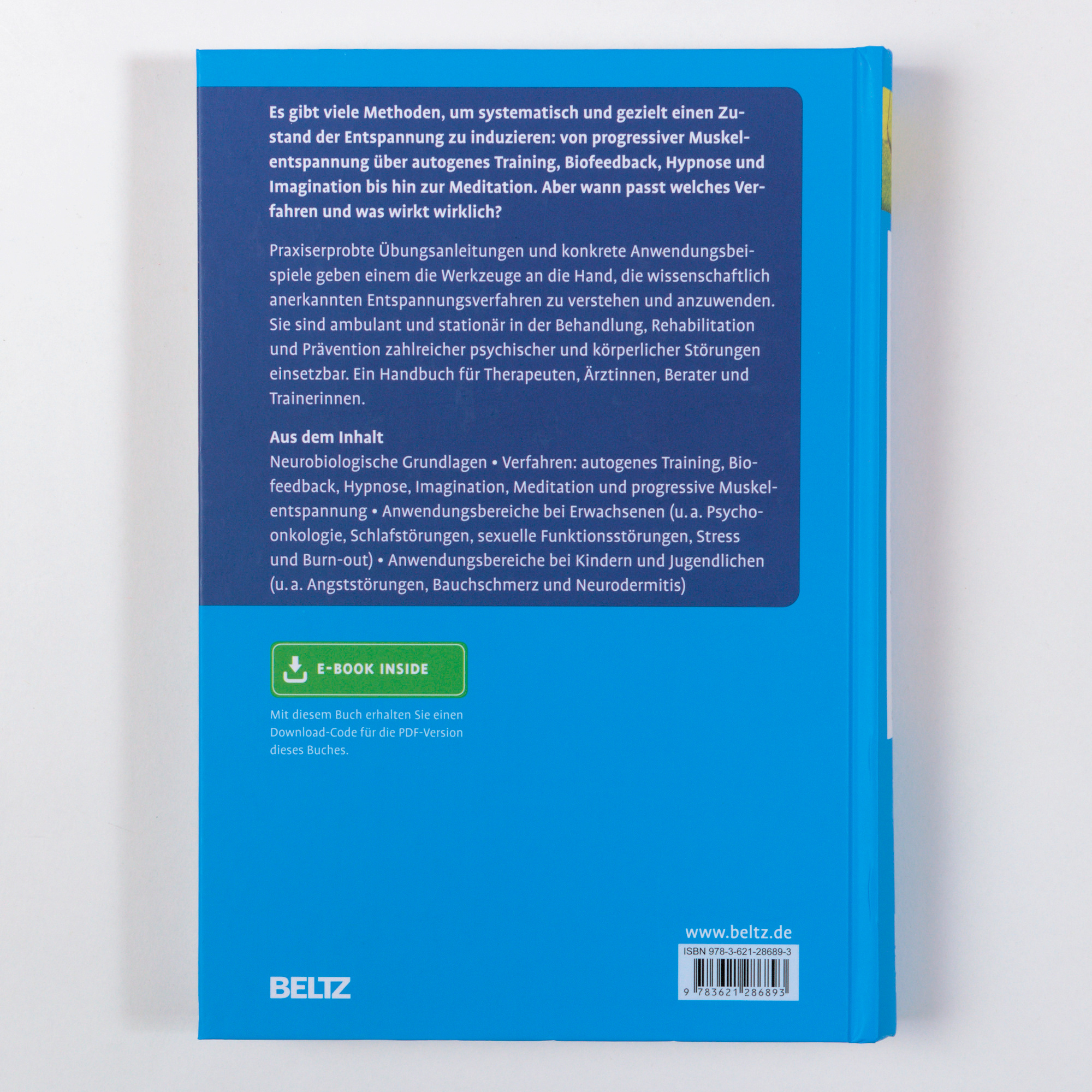 | Schlagworte | Autogenes Training • Beratung • Biofeedback • Entspannung • Entspannungsverfahren • Hypnose • Imagination • Kinder- und Jugendlichenpsychotherapie • Körperliche Erkrankung • Körperliche Erkrankung • Meditation • Prävention • Prävention • Progressive Muskelentspannung • Psychische Störung • Psychische Störung • Psychotherapie • Schmerz • Stress • Verhaltenstherapie |
